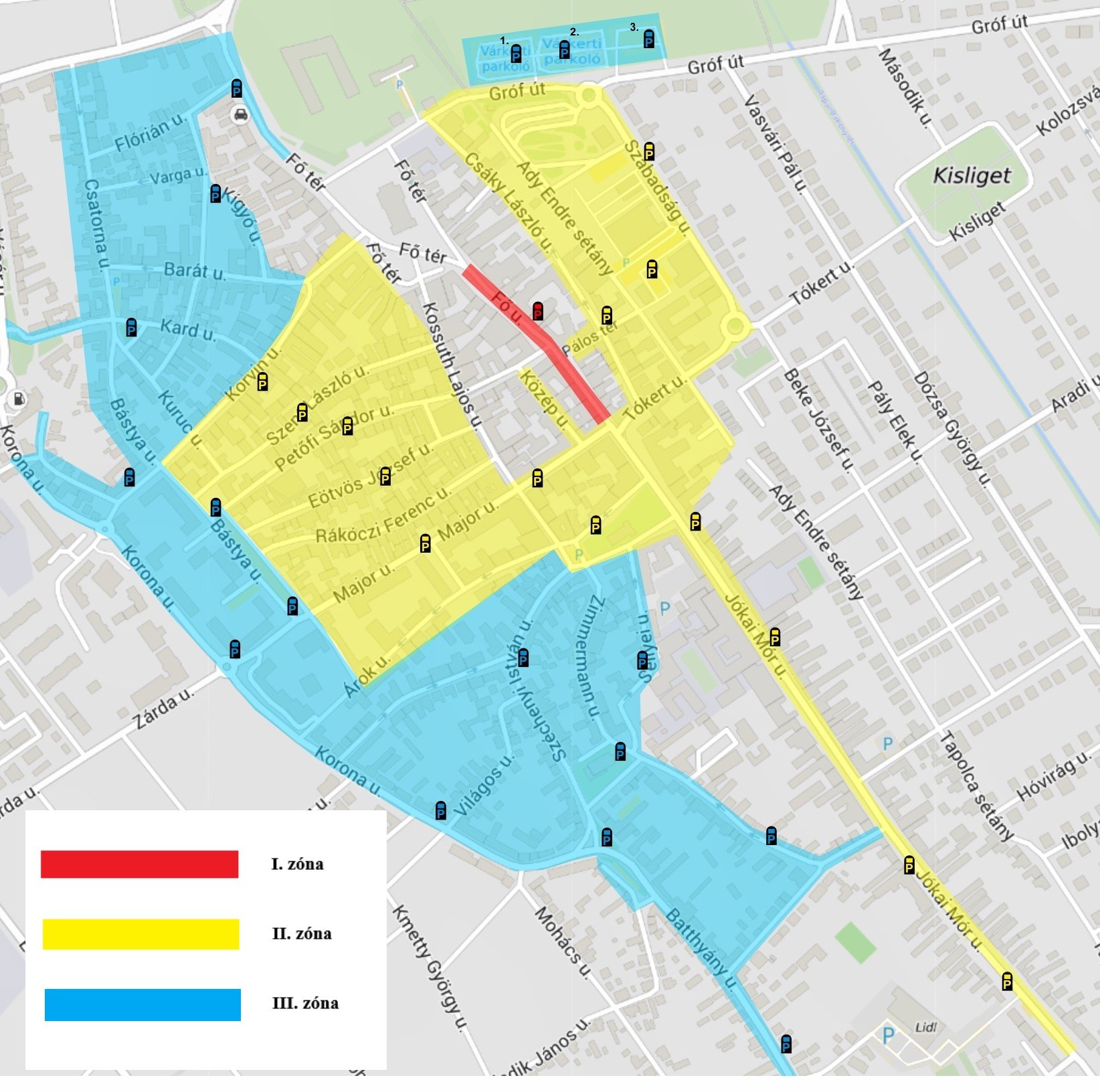 II. zóna: Március 15. tér, Kossuth Lajos utcának a Március 15. tértöl a Deák Ferenc utcáig terjedő szakasza, Major utca, Ányos Pál utca, Árok utca, Deák Ferenc utca, Közép utca, Rákóczi Ferenc utca, Eötvös utca, Petőfi Sándor utca, Szent László utca, Kuruc utca, Korvin utcának a Fő tértől a Bástya utcáig terjedő szakasza, Pálos tér, Csáky László utca, Ady Endre sétány, Tókert utca, Szabadság utca, Böröczky domb, Jókai utca (300 Ft/óra)