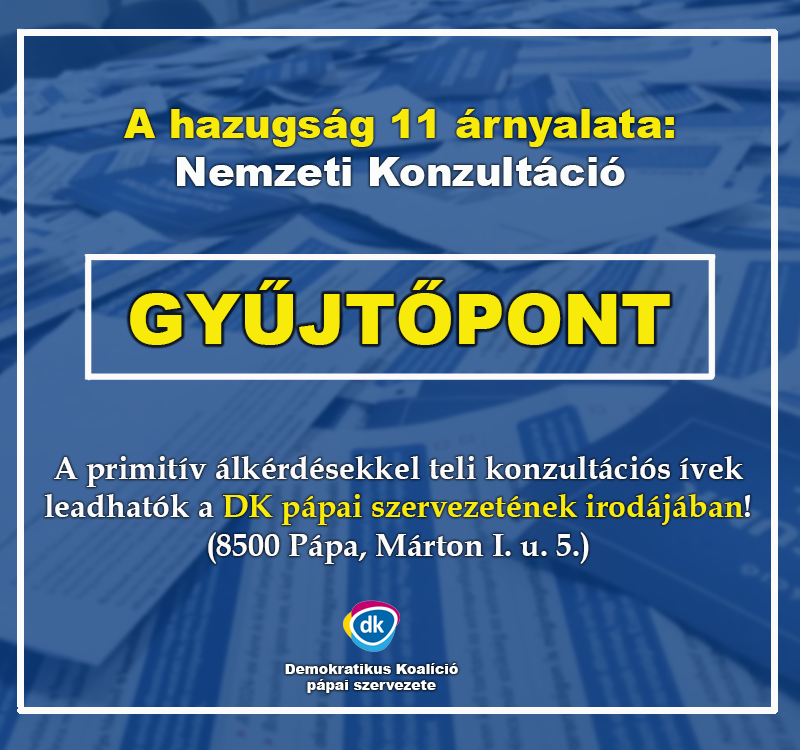 - A napokban Pápán is megkezdődött a kormány által indított nemzeti konzultációs ívek kézbesítése. A kérdések – akárcsak tavaly – nem mások, mint a kormány álkérdései, melyek célja a politikai manipuláció, nem pedig valódi társadalmi párbeszéd - mondta el ma délutáni sajtótájékoztatóján Molnár Bálint hozzátéve, a DK pápai közössége ismételten úgy döntött, hogy megszervezi a konzultációs ívek gyűjtését, hogy "minél többen kifejezhessék elégedetlenségüket a kormány hazug és álságos kérdéseivel kapcsolatban".