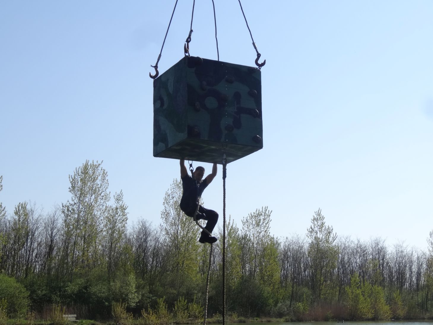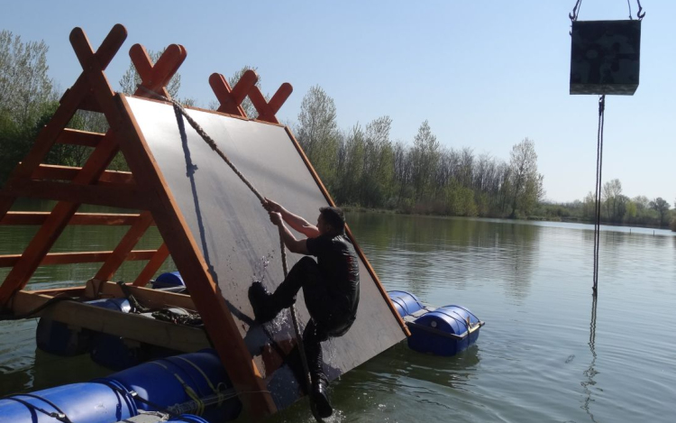 Lenvai Gábor, az akadályfutó verseny másik szervezője hozzátette, a tavalyinál idén még több nagy nehézségi fokú akadályt állítottak fel a pápai katonák, olyanokat, mint az alábbi képen látható úgynevezett Monstrum. Ezen a teljesen egyedi akadályon először egy négy méteres tűzoltó tömlőn kell felmászni, majd öt-hat méter hosszan egy vízszintes kötélen felkapaszkodni. Ezután egy kötélen leereszkedni és egy kötél háló alján tovább mászni, végül pedig egy gerendáról lelógó kötélhurkokon kapaszkodva haladni. Ilyen összetett akadályokokkal más hasonló versenyekkel nem igazán lehet találkozni Magyarországon - mondta el Lendvai Gábor.