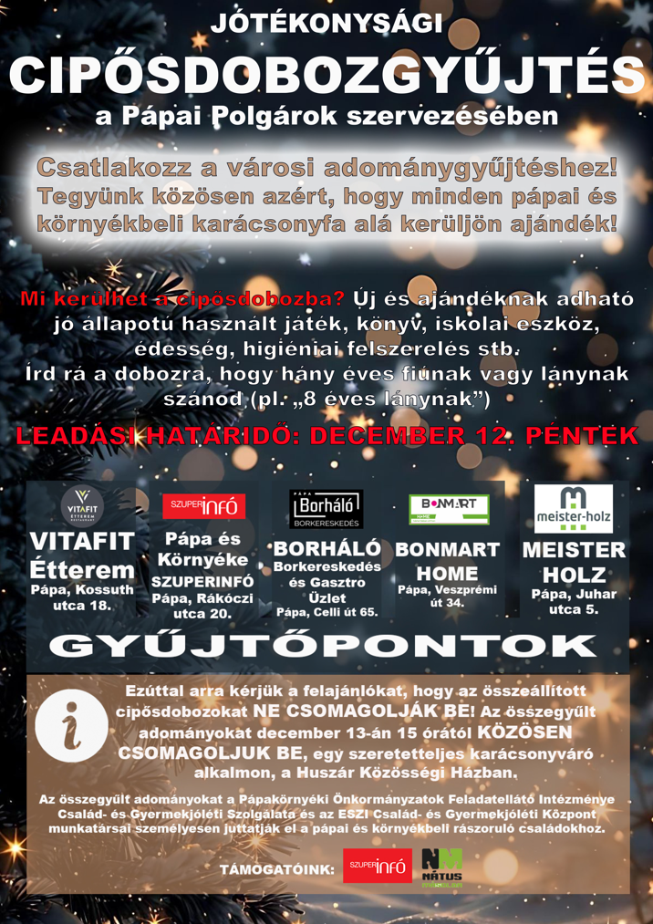 2023-ban minden várakozást felülmúló mennyiségű adomány érkezett a Pápai Polgárok gyűjtőpontjaira. A nagy siker után nem is lehetett kérdés, hogy újra megrendezik-e a cipősdoboz adománygyűjtést, hiszen sok család már számított is arra, hogy érkezik a segítség a szeretet ünnepe előtt. Nincs ez másként idén sem, a Pápai Polgárok lelkes csapata meghirdette az adománygyűjtést.