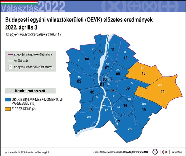 Vidéken két körzet kivételével mindenhol narancssárgára színezték a választókerületeket a választók, Budapesten fordított az arány.