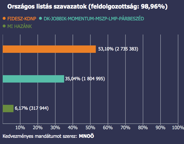 A pártok listájára leadott szavazatok arányában is rendkívüli a Fidesz győzelme, majdnem 1 millióval többen szavaztak a kormánypártokra, mint az ellenzéki összefogásra.