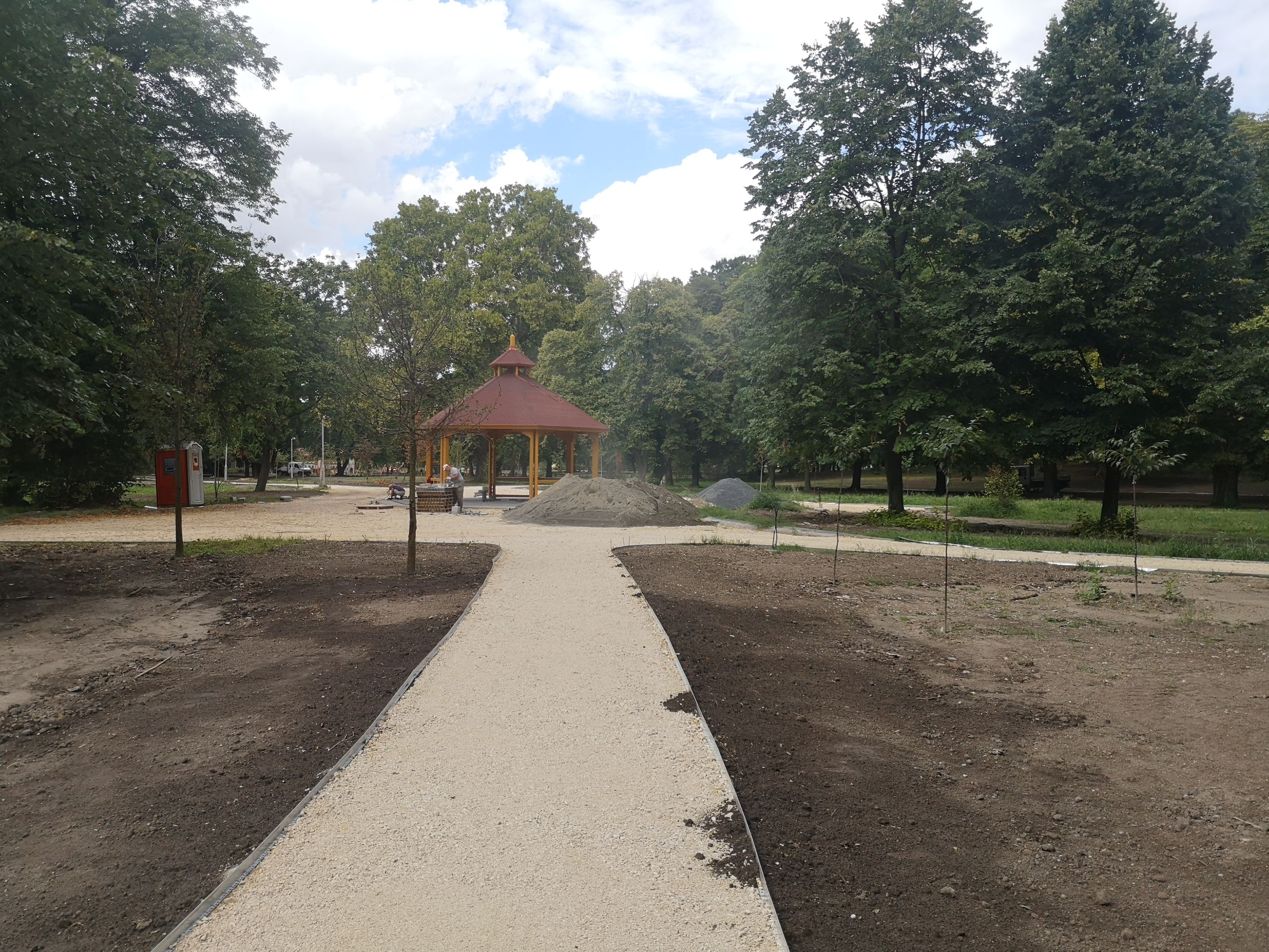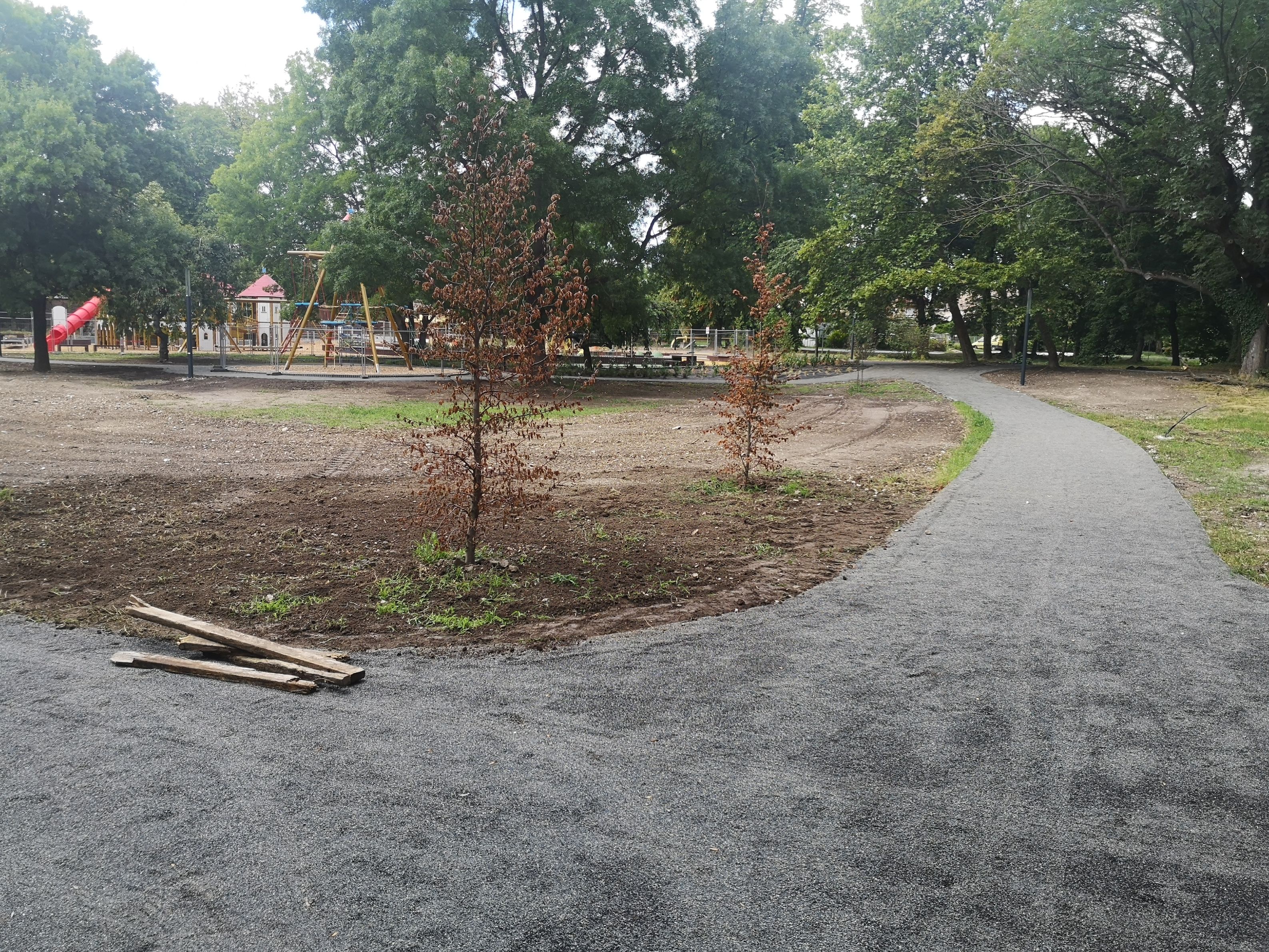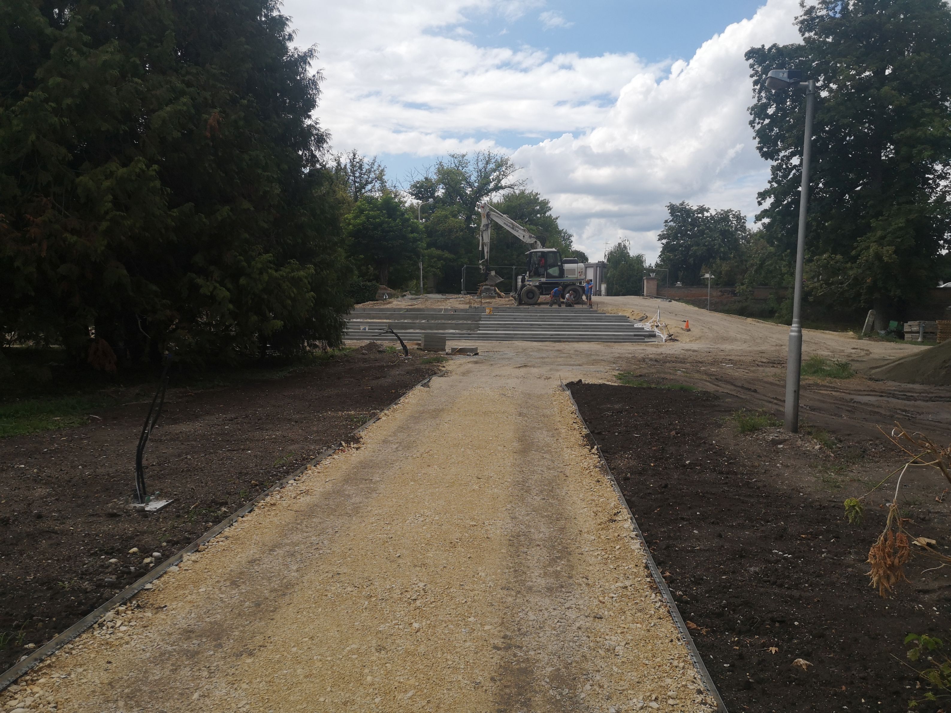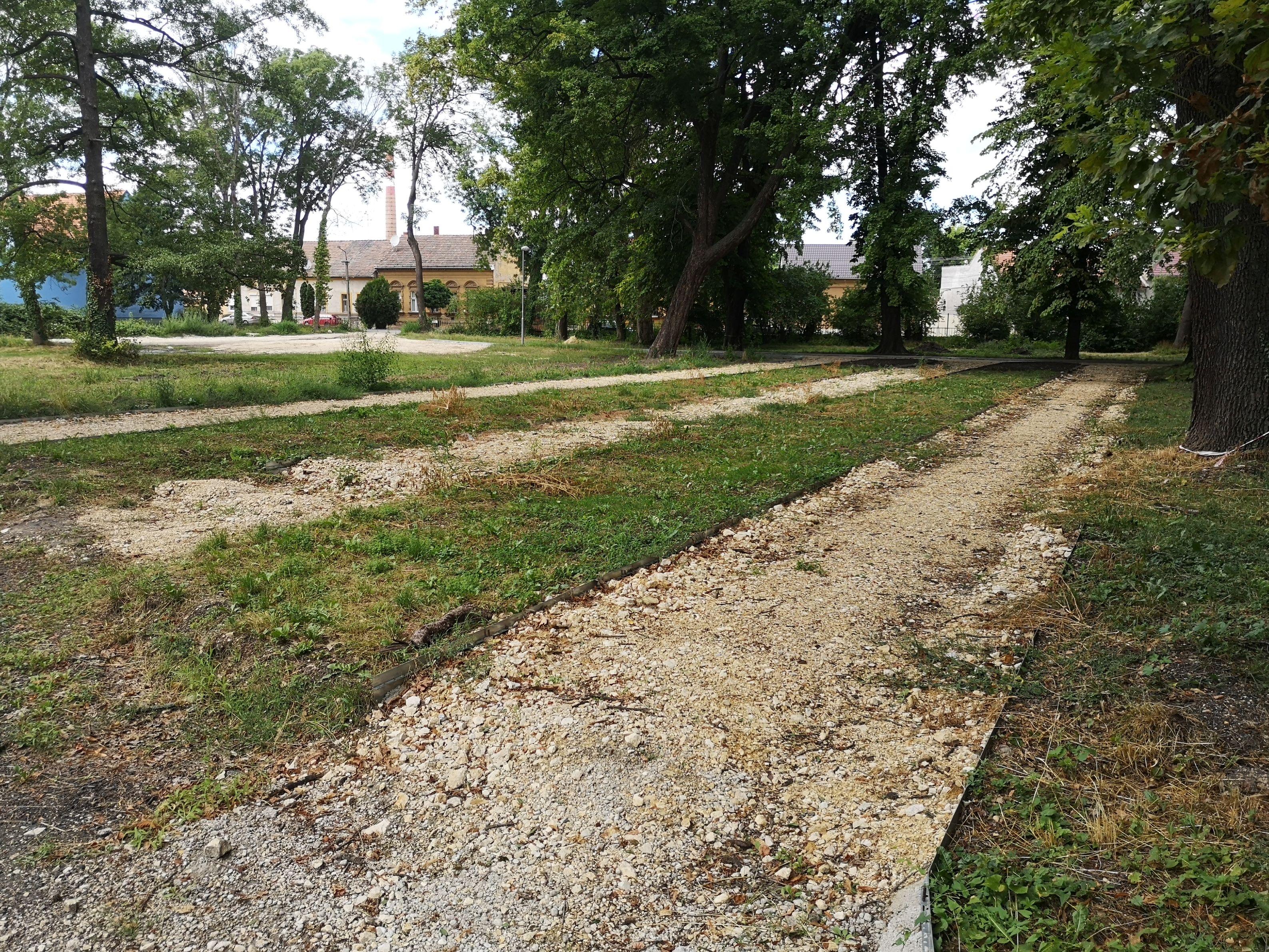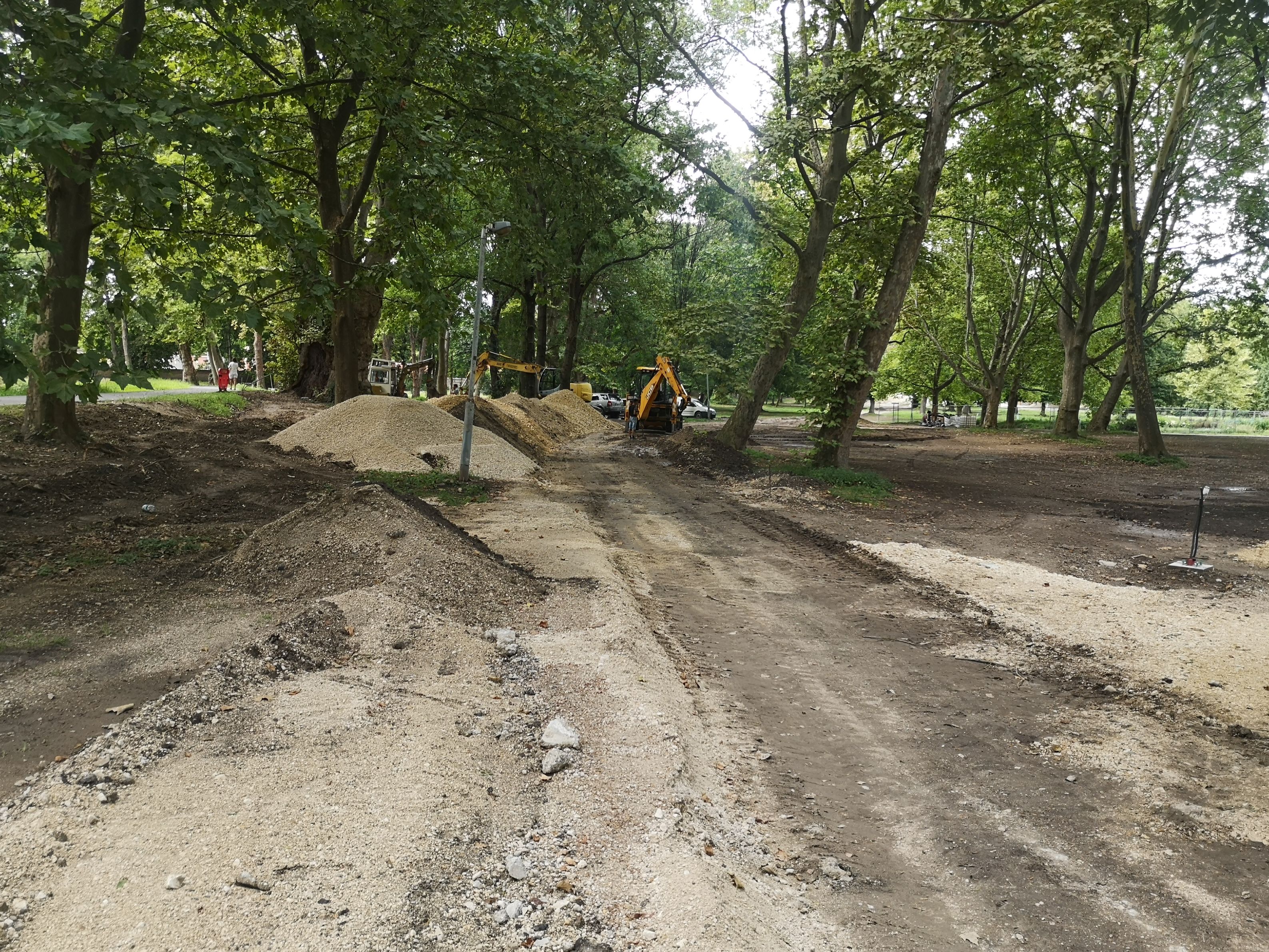 Az új játszótér környékén kezdték meg az új burkolatok elkészítése. A sétányok kőzúzalék, a futókör pedig ütéscsillapító mulcsburkolatot kap.