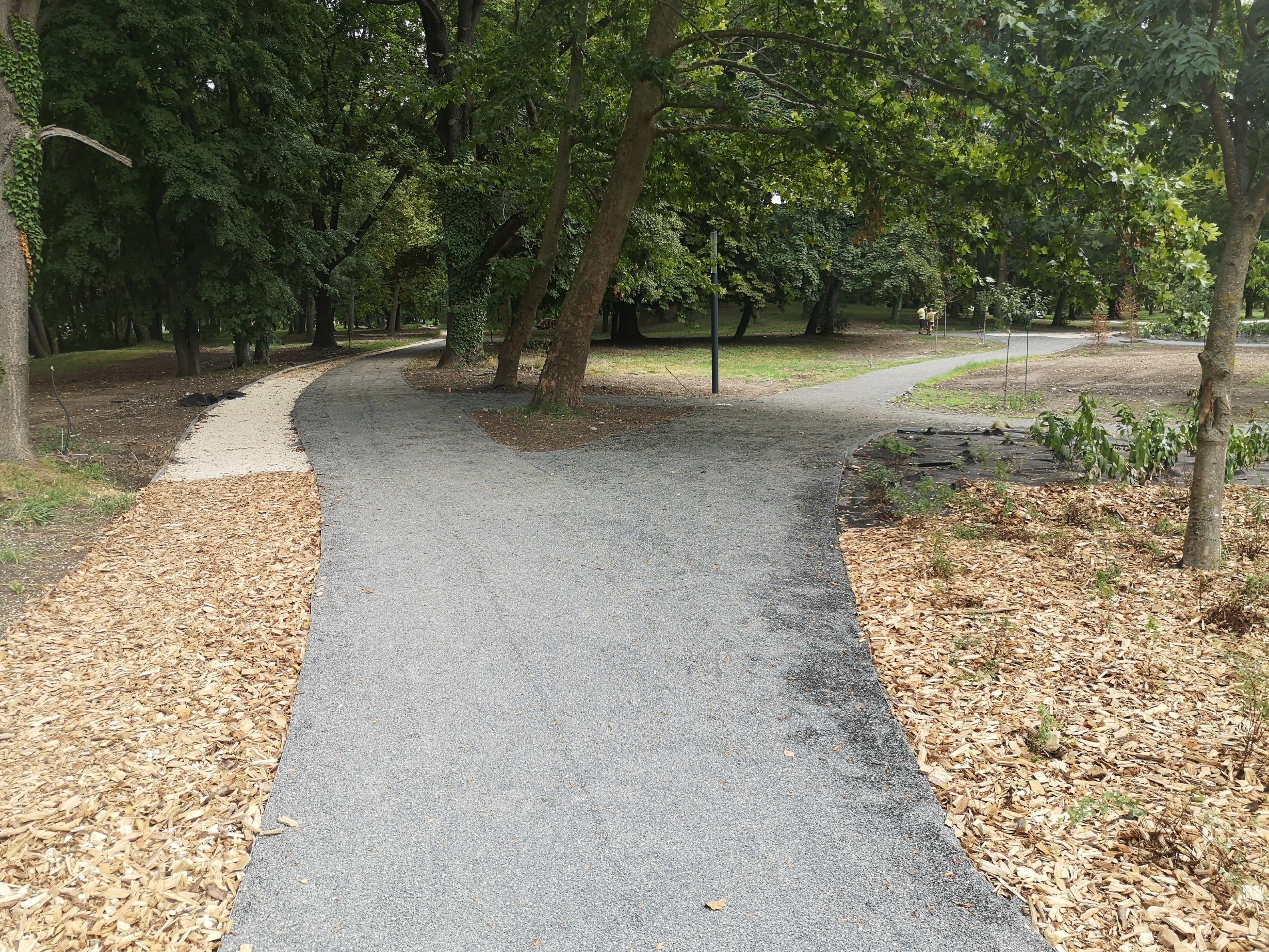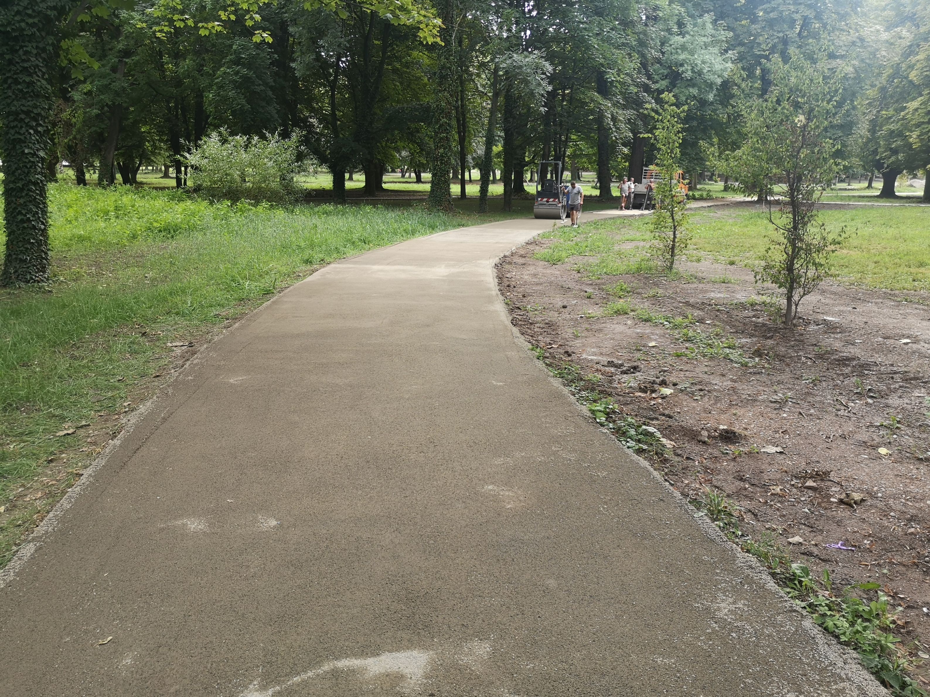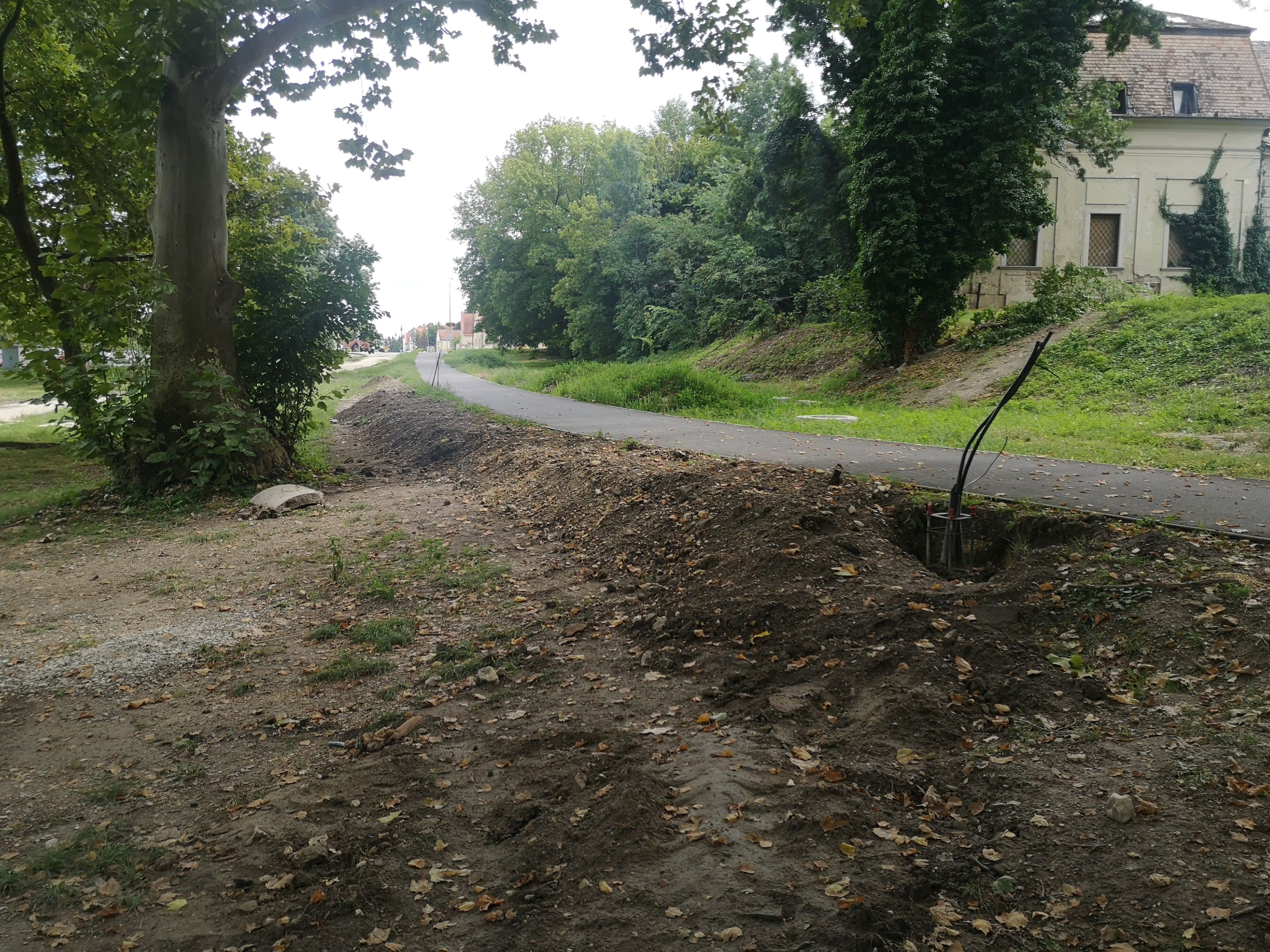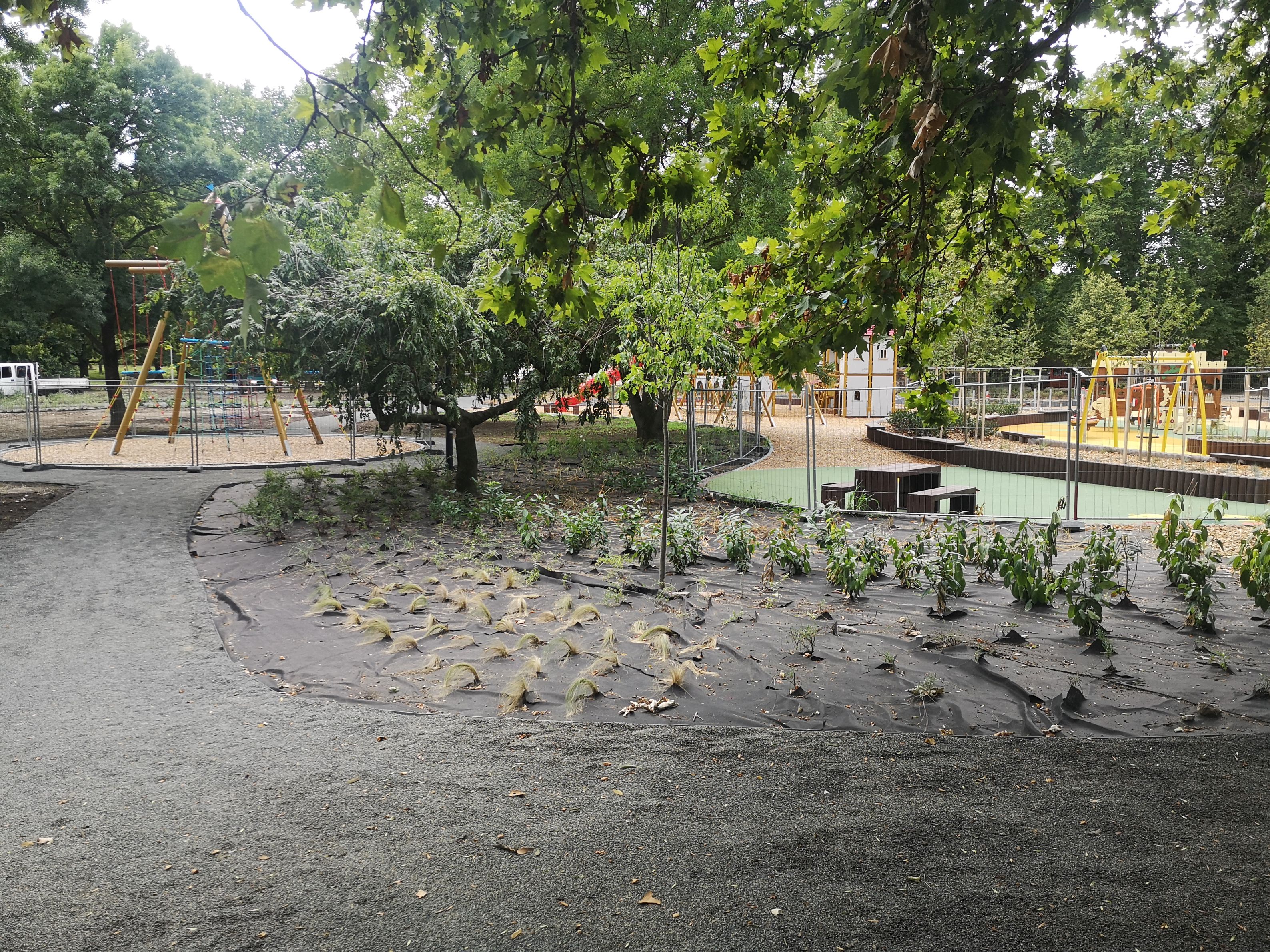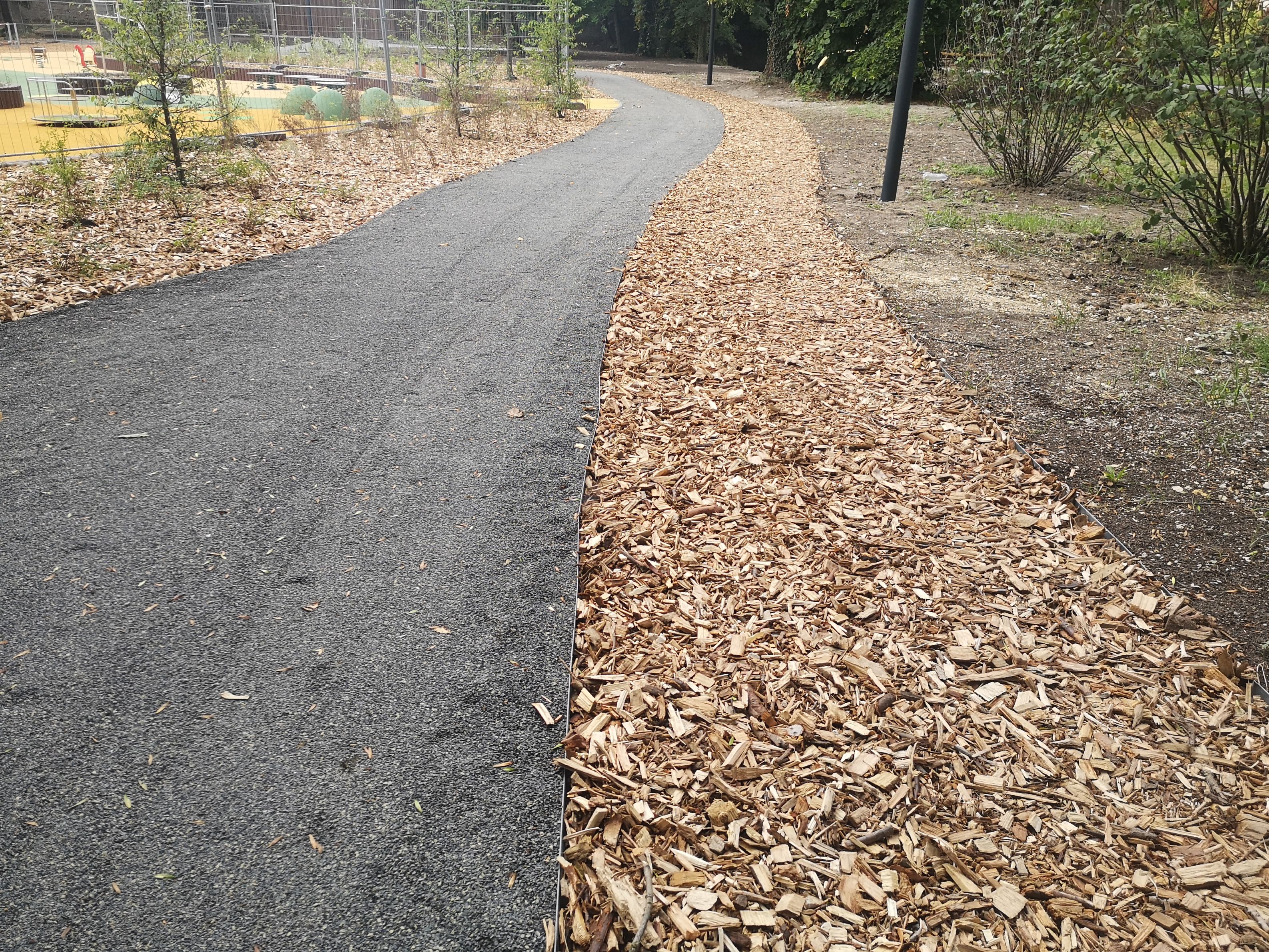 Az új játszótér környékén kezdték meg az új burkolatok elkészítése. A sétányok kőzúzalék, a futókör pedig ütéscsillapító mulcsburkolatot kap.