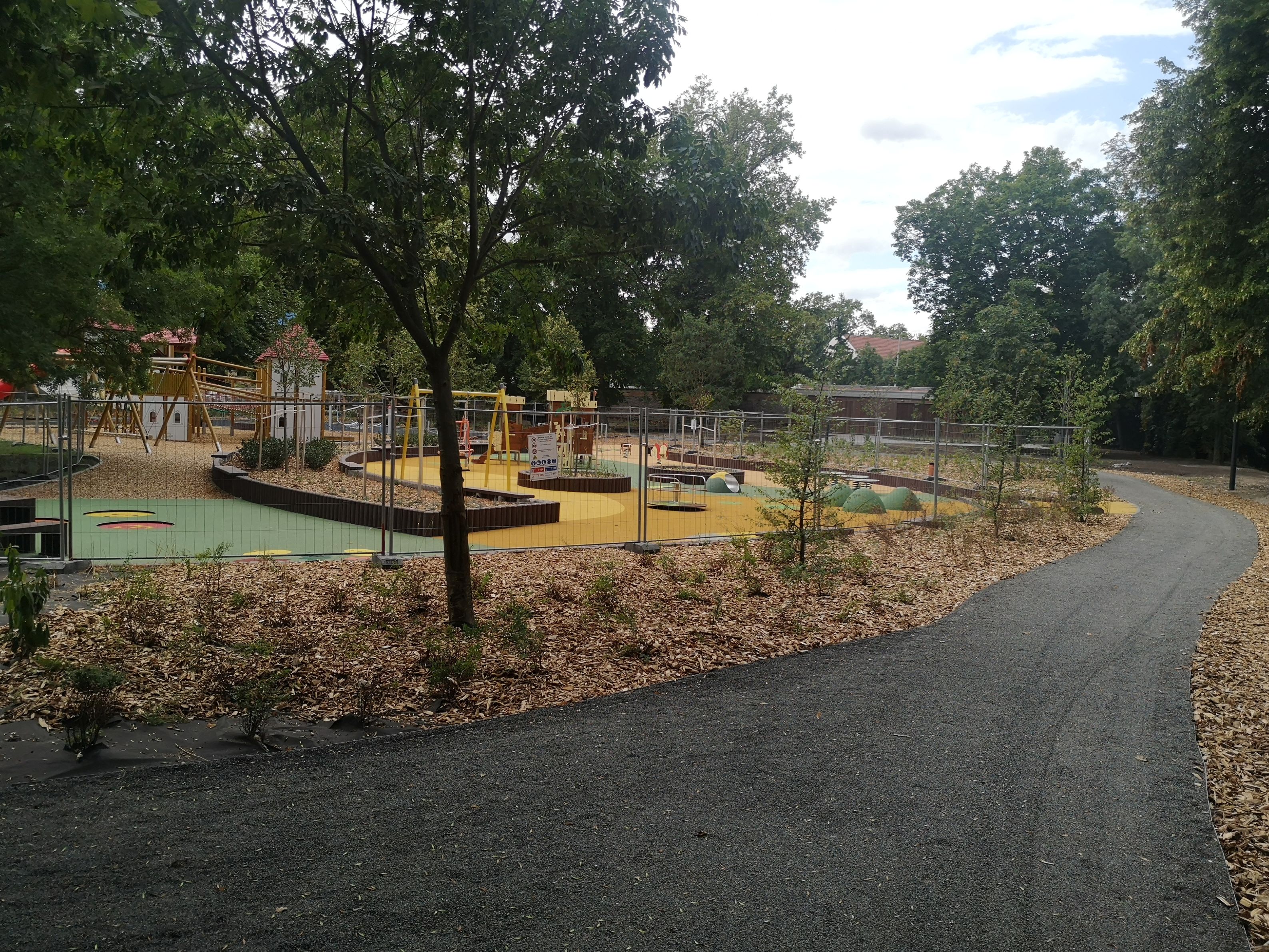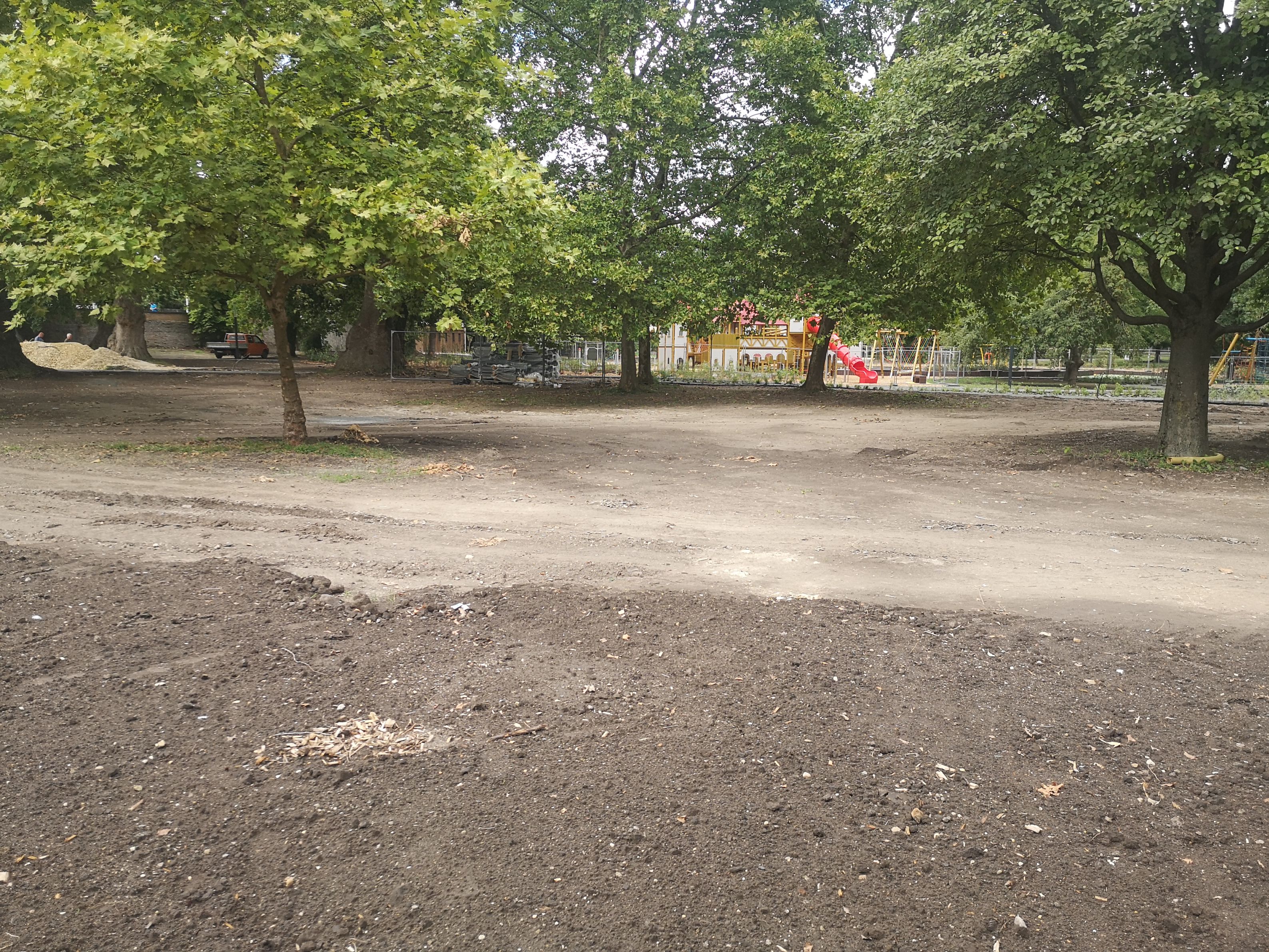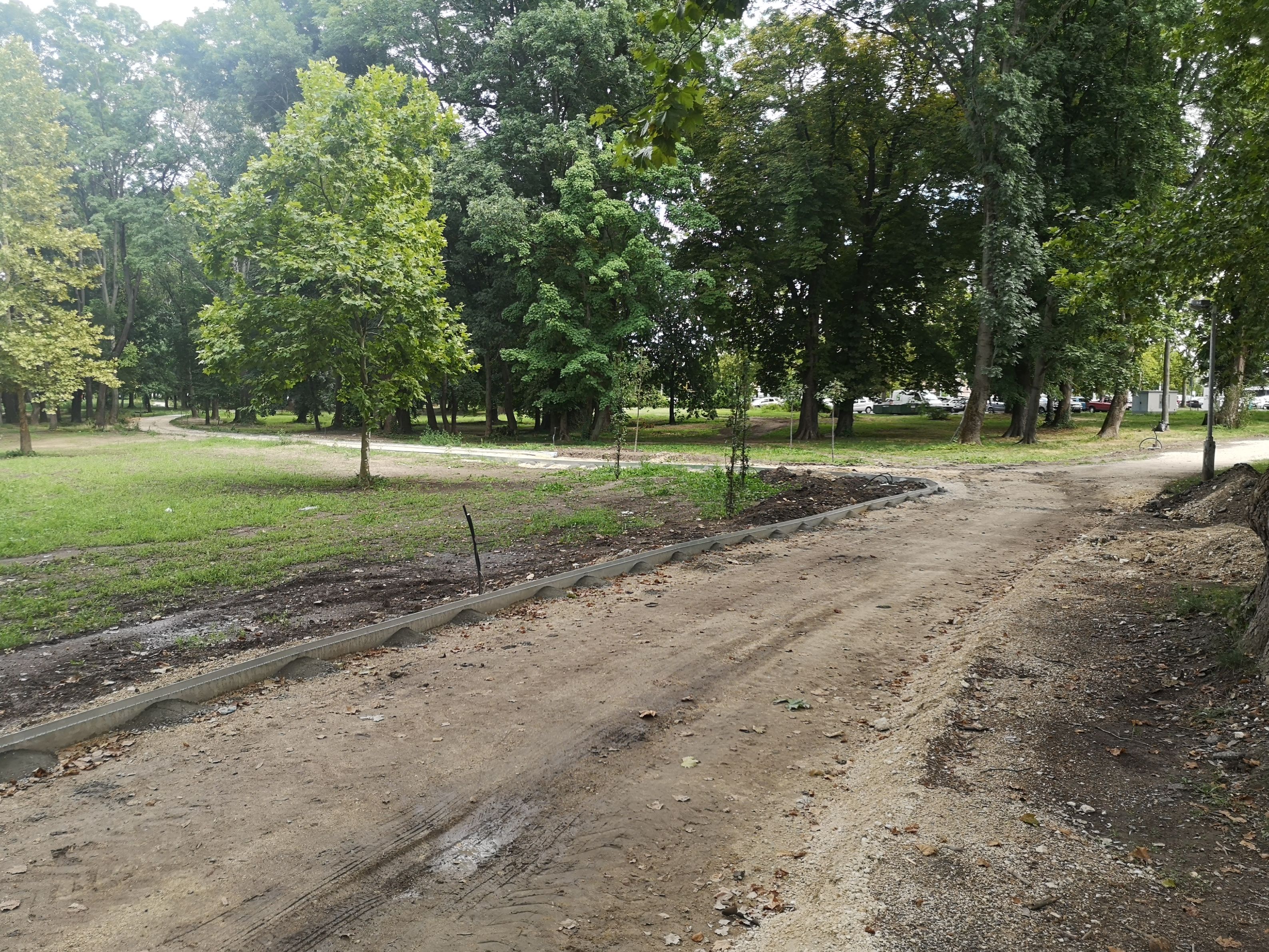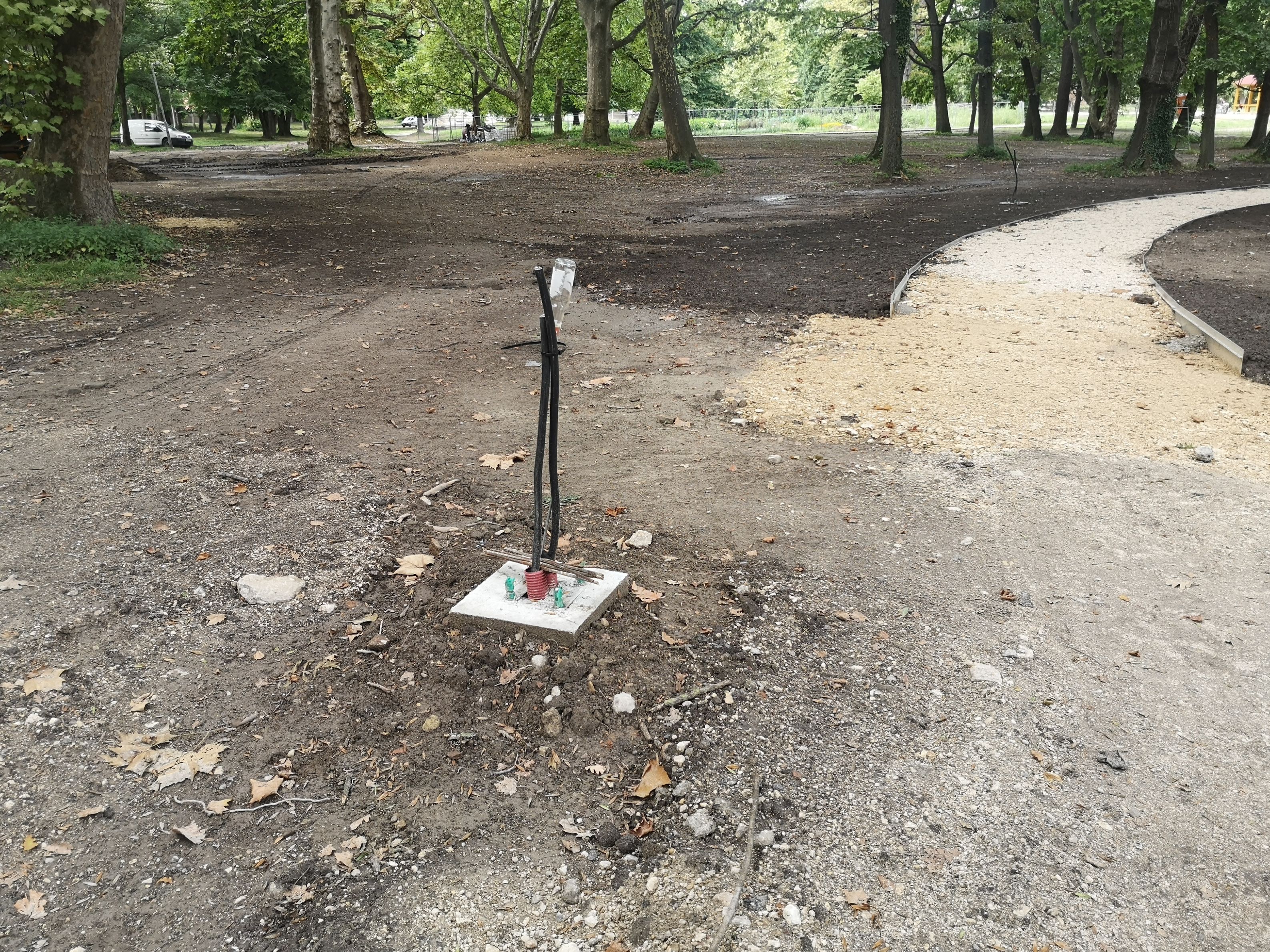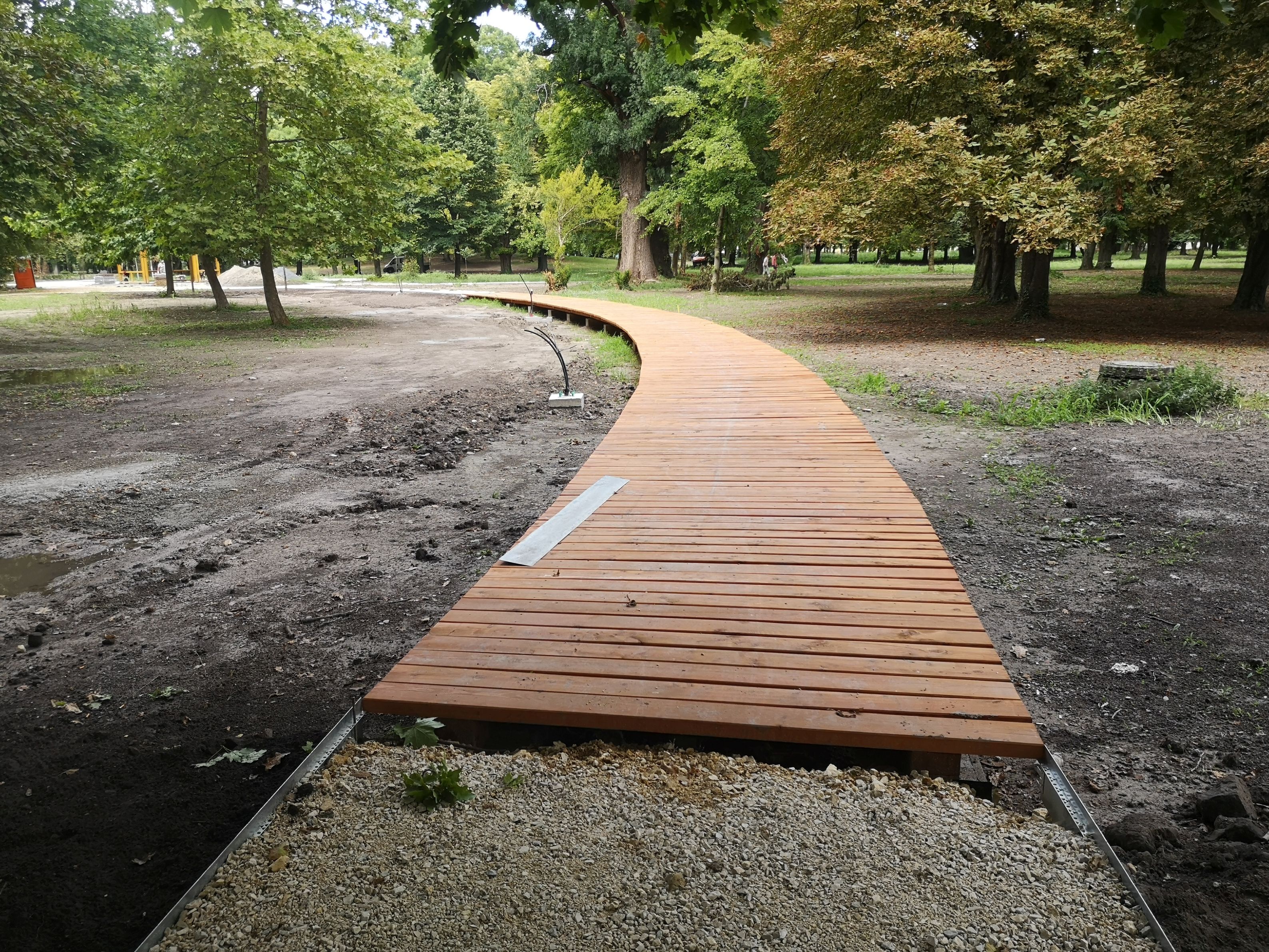Az új játszótér környékén kezdték meg az új burkolatok elkészítése. A sétányok kőzúzalék, a futókör pedig ütéscsillapító mulcsburkolatot kap.
