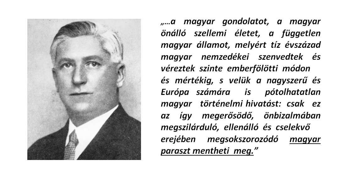 „Millió és millió hold földdel kell meggyarapítani a magyar paraszti nép létalapját és azon kívül sok minden egyébbel megjavítani sorsát, megkönnyíteni és szebbé tenni életét. Nem is csak szociális és emberi igazság beteljesítésére, hanem még inkább azért, mert a magyar gondolatot, a magyar önálló szellemi életet, a független magyar államot, melyért tíz évszázad magyar nemzedékei szenvedtek és véreztek szinte emberfölötti módon és mértékig, s velük a nagyszerű és Európa számára is pótolhatatlan magyar történelmi hivatást: csak ez az így megerősödő, önbizalmában megszilárduló, ellenálló és cselekvő erejében megsokszorozódó magyar paraszt mentheti meg. Senki, senki, senki más!!”