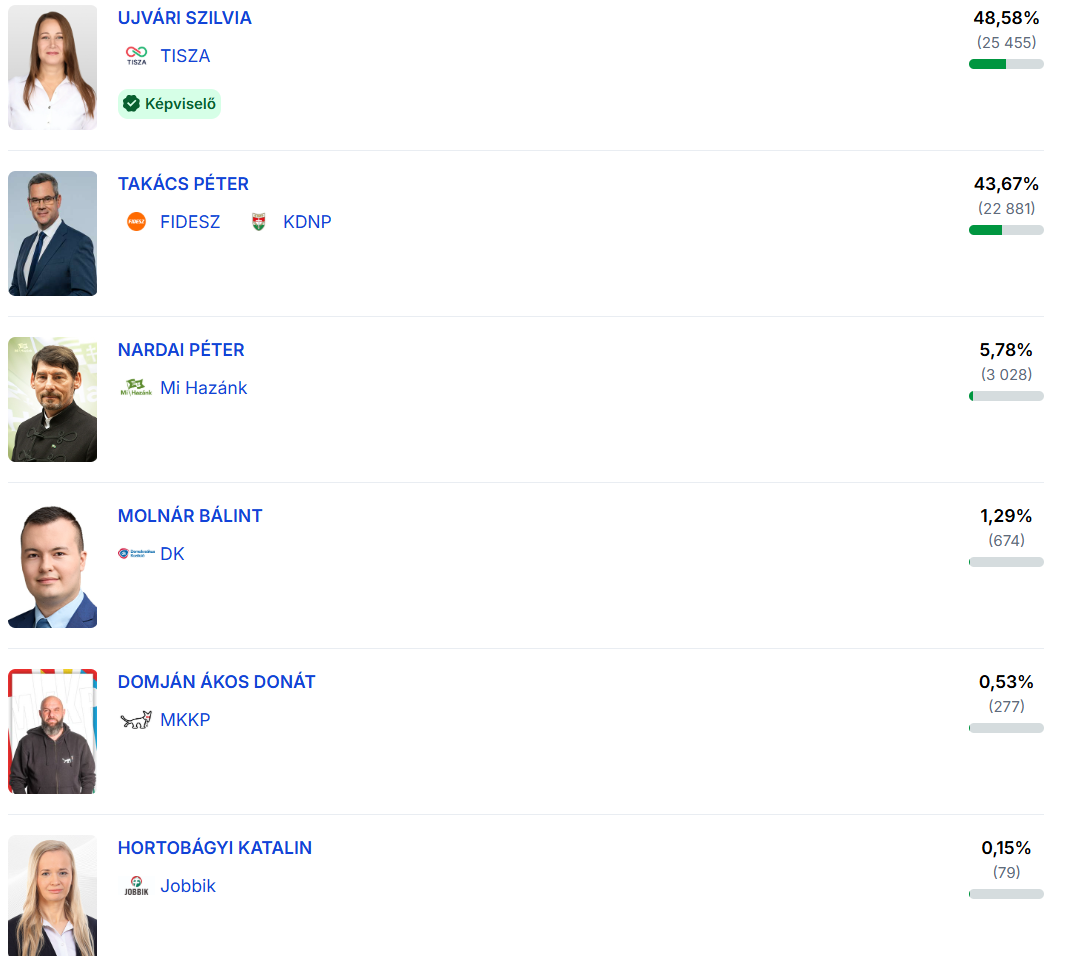 Ujvári Szilvia (Tisza Párt): 25 455 szavazat (48,58%)