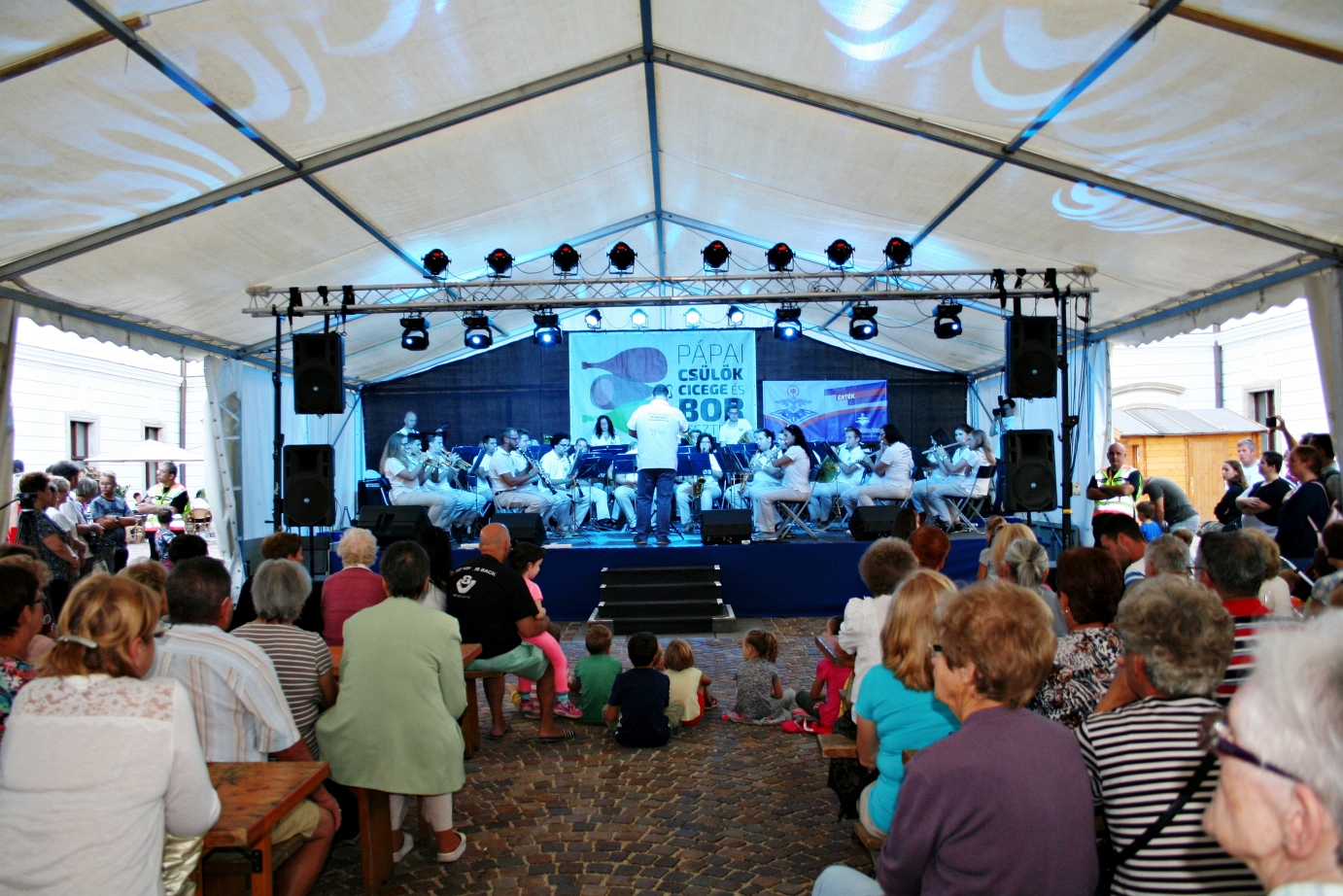 Borfesztivál ide, vagy oda, a szervezők minden korosztályra gondoltak, a délutáni programok sorát kézműves játszóház nyitotta. A kastély foglalkoztató tereiben perecet, sünit, illetve farmer táskát készíthettek az apróságok és szüleik. 17 órakor kezdődtek a színpadi programok, elsőként a Nefelencs Népdalkör és Citerazenekar, majd Pápa Város Fúvószenekara szórakoztatta a sátor népes közönségét.
