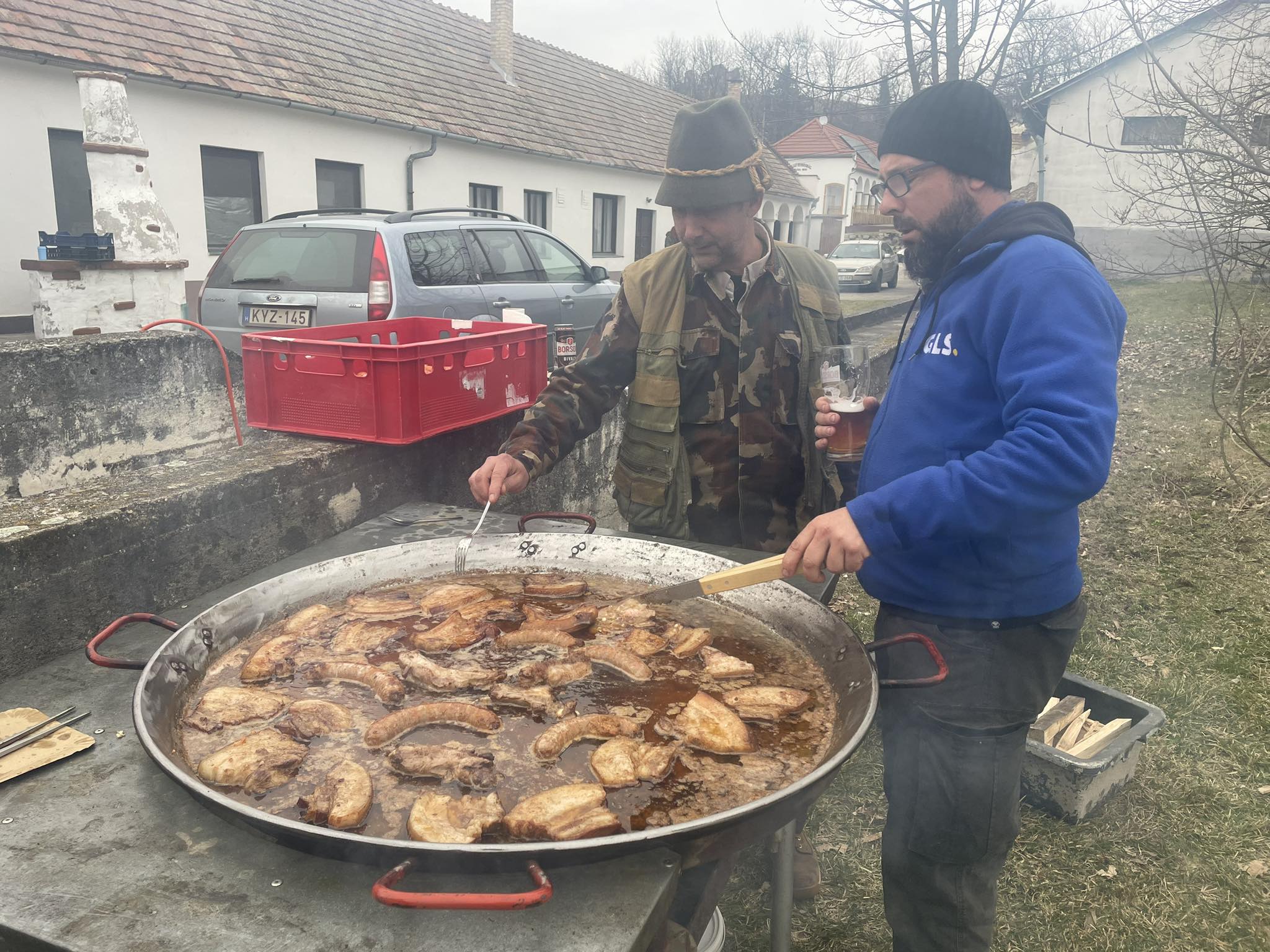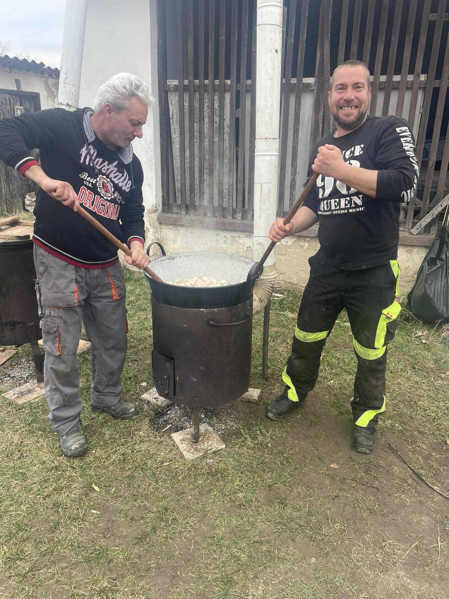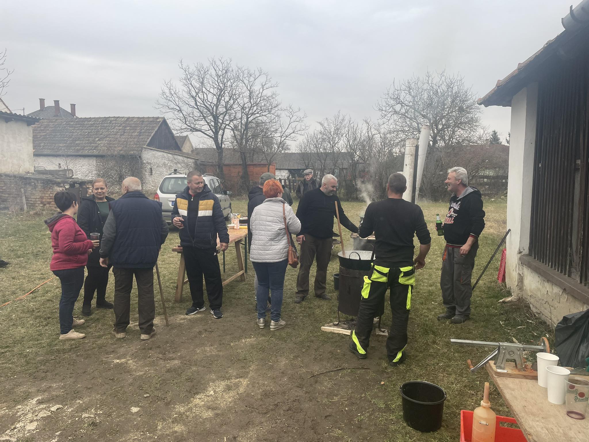Már korán reggel - ahogy azt illik - helybeliekből álló lelkes kis csapat nekiállt a hagyományos disznóvágásnak Döbröntén. Ezúttal azonban nemes célokat szolgált az állat feldolgozása, Szántó József ötlete nyomán ugyanis az elkészült finomságokból megvendégelték a falu lakosságát, sőt, a település idősebb lakónak kis csomagokkal kedveskedtek.