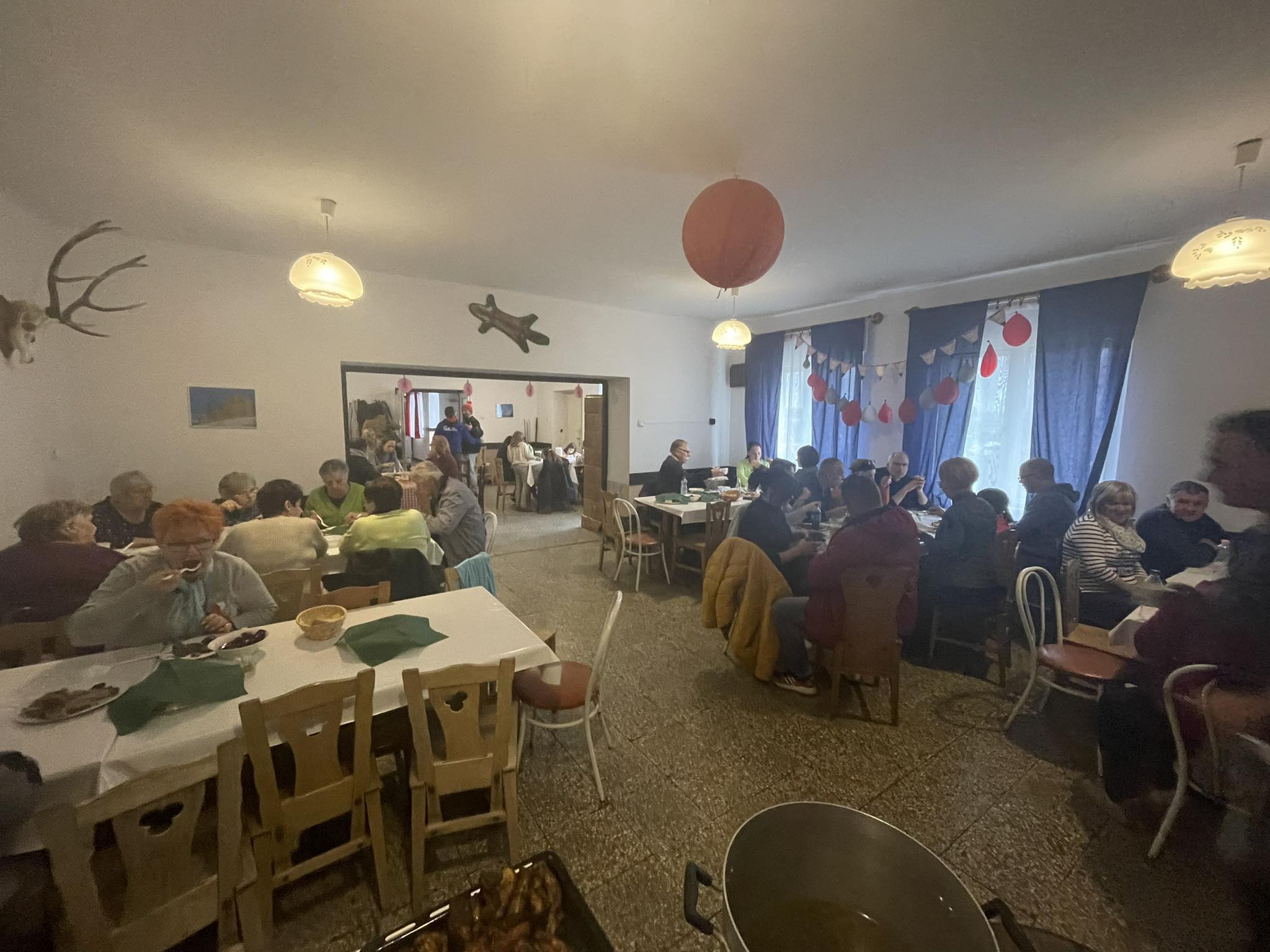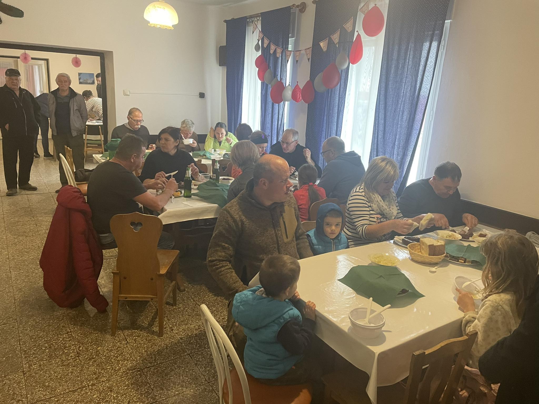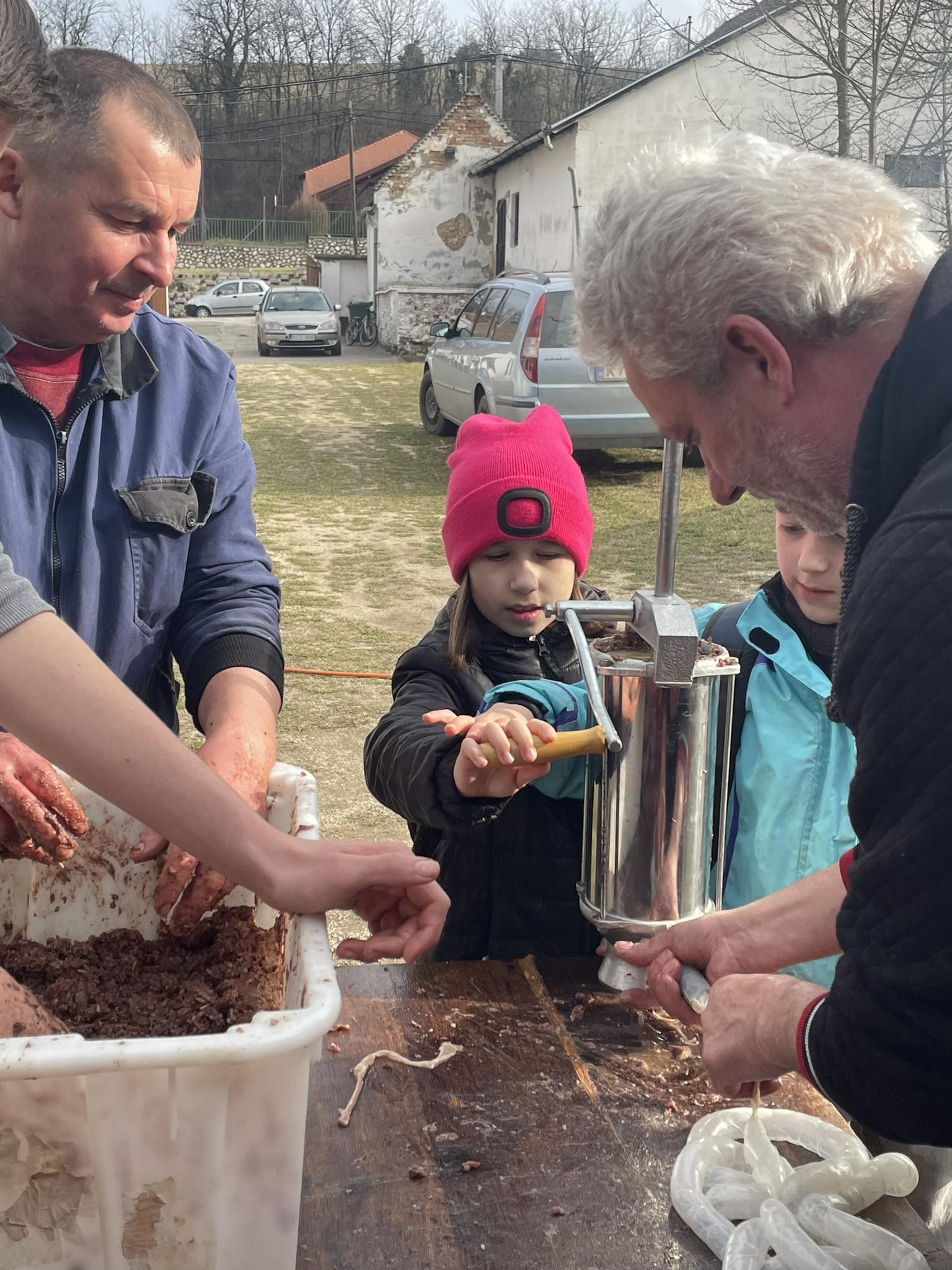 Már korán reggel - ahogy azt illik - helybeliekből álló lelkes kis csapat nekiállt a hagyományos disznóvágásnak Döbröntén. Ezúttal azonban nemes célokat szolgált az állat feldolgozása, Szántó József ötlete nyomán ugyanis az elkészült finomságokból megvendégelték a falu lakosságát, sőt, a település idősebb lakónak kis csomagokkal kedveskedtek.