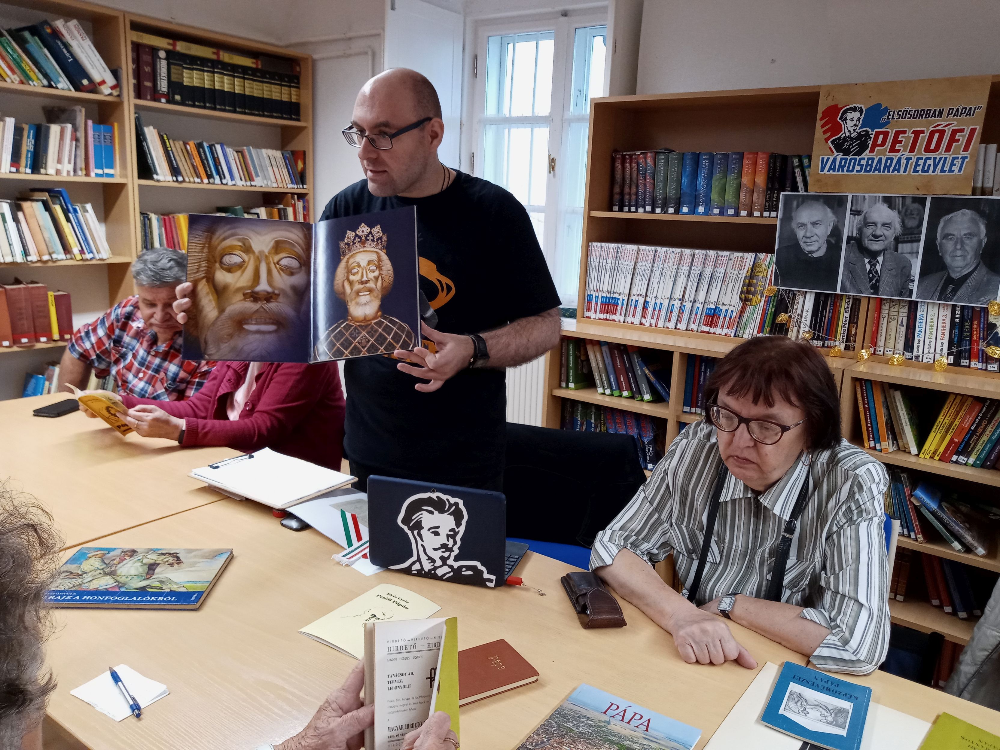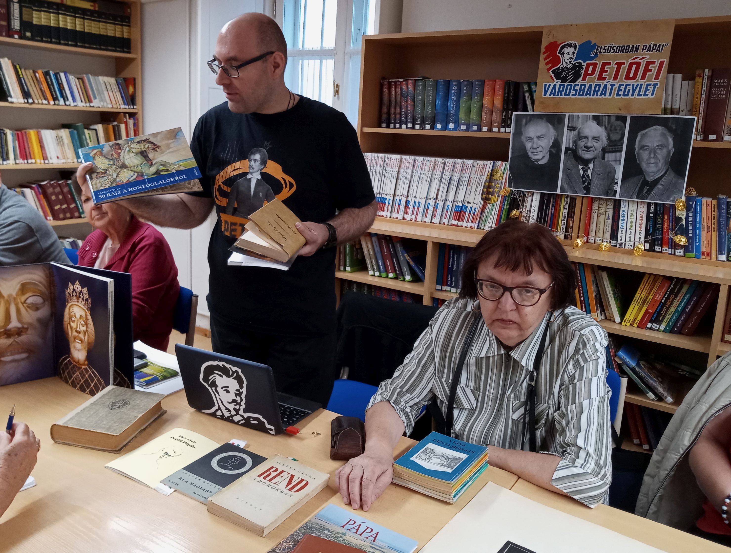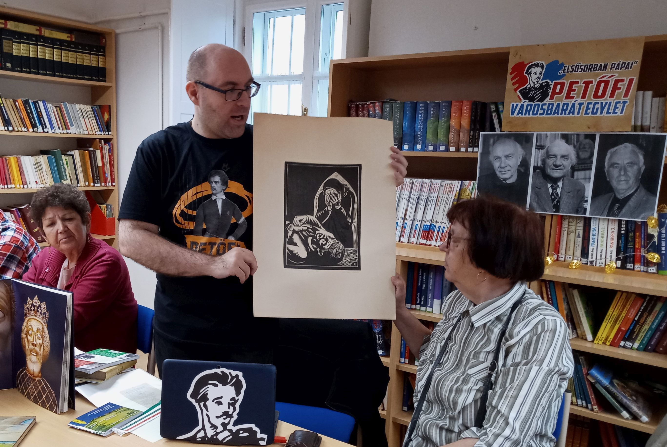 Az egylet önkéntese, Váminé Molnár Emma nyugalmazott városi könyvtáros a hét esztendeje elhunyt Heitler László munkásságát elevenítette fel, méghozzá azon több mint ötven éve, a Magyar Hirdető Pápai Kirendeltsége keretein belül közreadott kis füzetsorozat segítségével, melyeket még a művésztanár írt, szerkesztett és illusztrált. A hallgatóságnak is körbeadott sorozatból kiemelte a Petőfi Sándor és Jókai Mór pápai kötelékeiről szólókat.