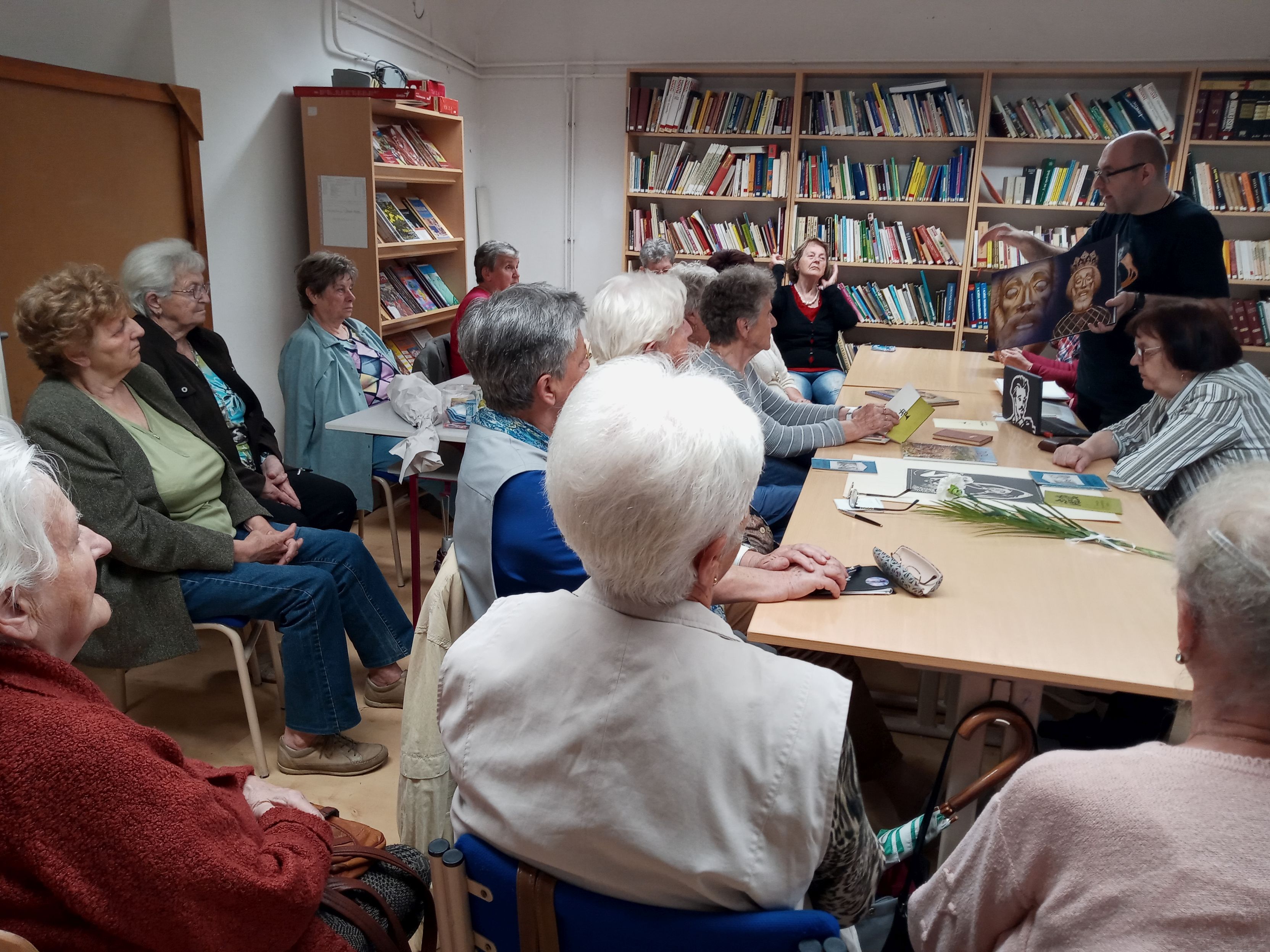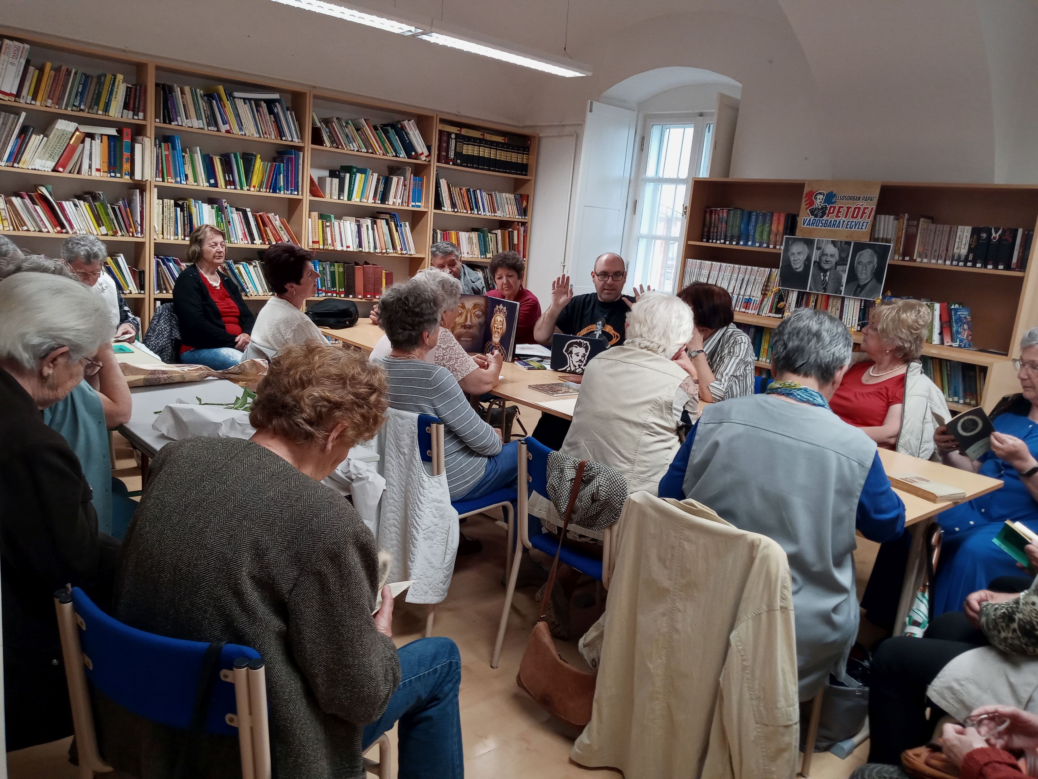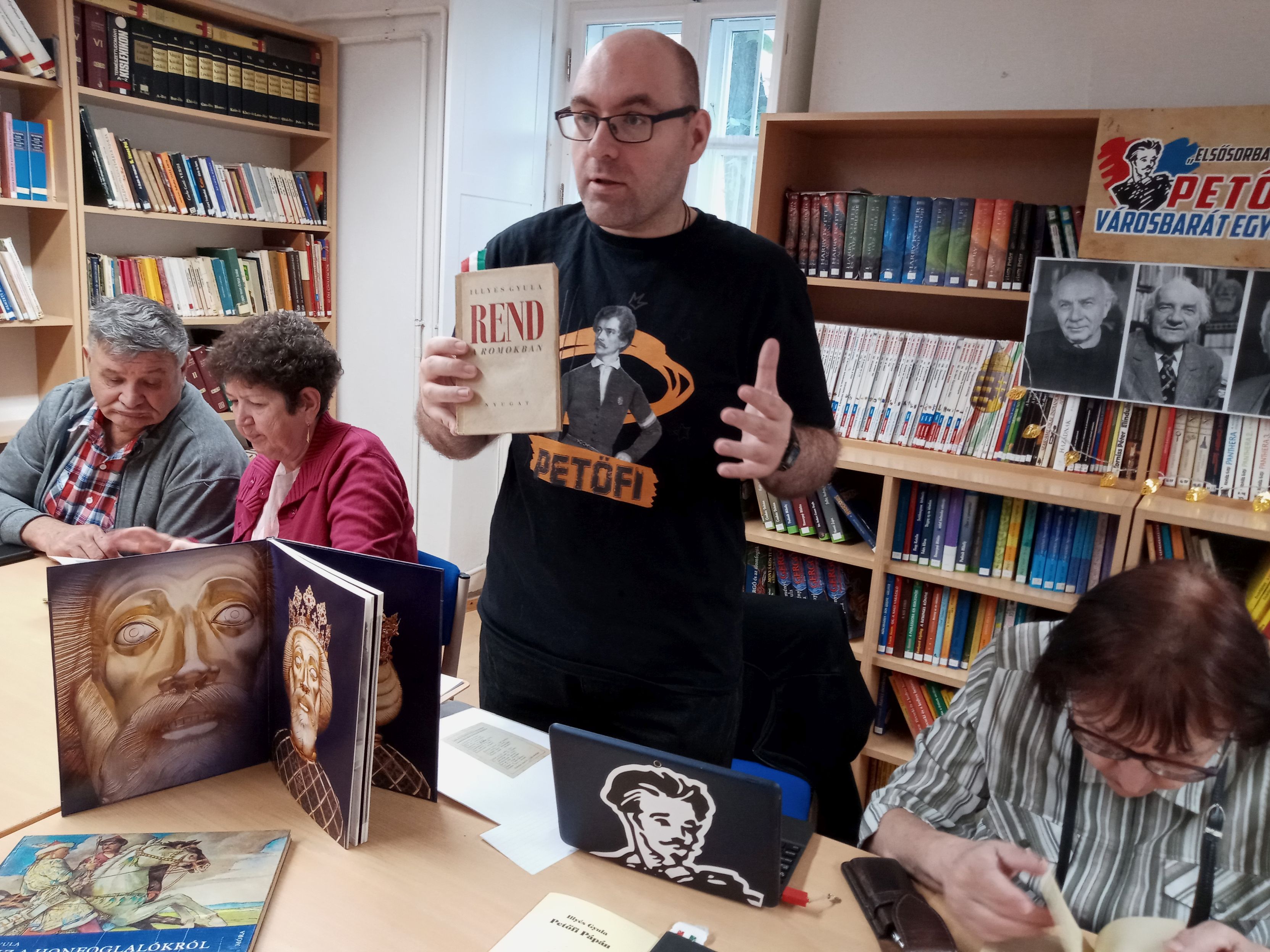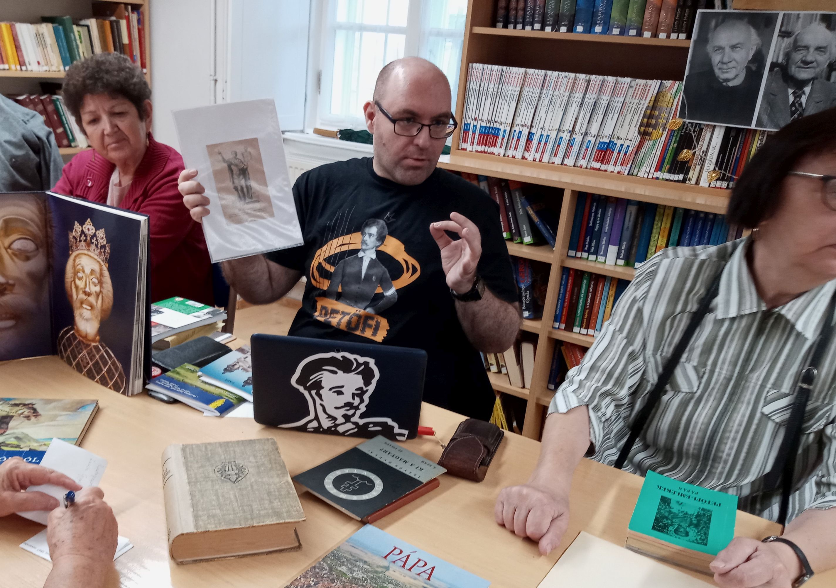 Az egylet önkéntese, Váminé Molnár Emma nyugalmazott városi könyvtáros a hét esztendeje elhunyt Heitler László munkásságát elevenítette fel, méghozzá azon több mint ötven éve, a Magyar Hirdető Pápai Kirendeltsége keretein belül közreadott kis füzetsorozat segítségével, melyeket még a művésztanár írt, szerkesztett és illusztrált. A hallgatóságnak is körbeadott sorozatból kiemelte a Petőfi Sándor és Jókai Mór pápai kötelékeiről szólókat.