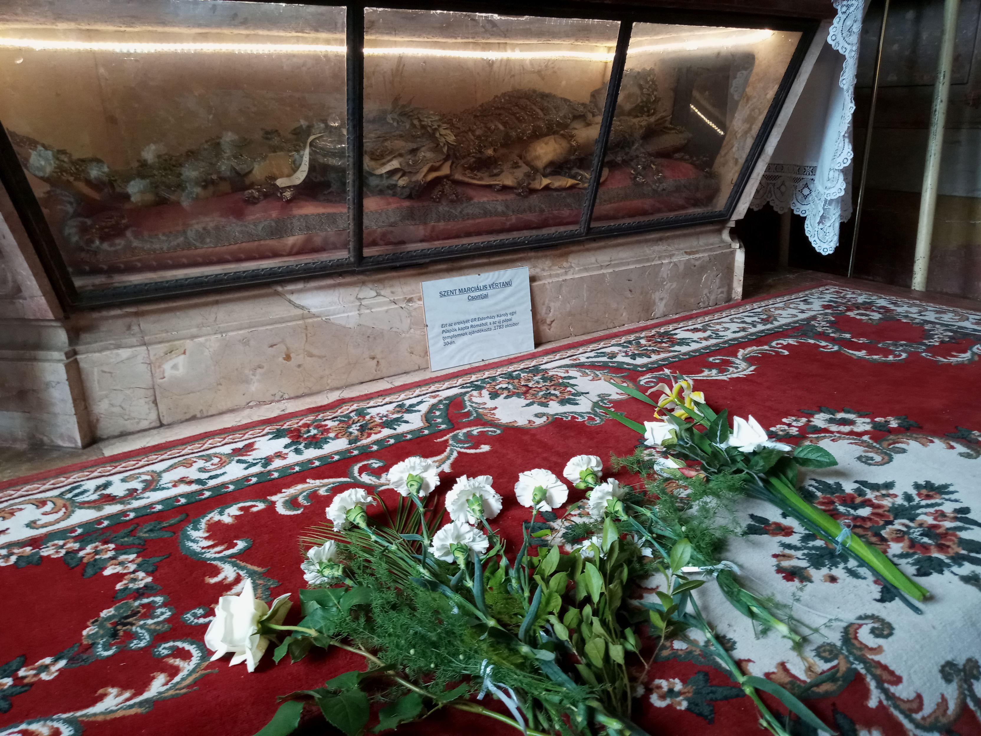 A kis civil közösség önkéntesei a reményt, a békességet, a tisztaságot jelképező fehér színű virágokat helyeztek el a 240 éve Pápára került, üvegkoporsóban nyugvó, hitvalló légionárius földi maradványainál, ahol