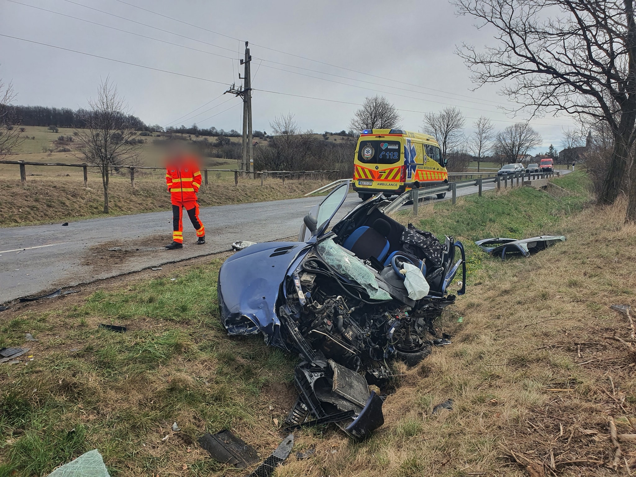 Az ütközés olyan erejű volt, hogy a kamion első kereke kitört és bebicskázva az árokba csapódott. A személyautó szintén az árokba csapódott, sofőrje egy negyven év körüli ajkai férfi a roncsok közé szorult. Őt az ajkai tűzoltók feszítővágóval szabadították ki. A helyszínen a mentők sokáig küzdöttek a férfi életéért míg szállítható állapotba került, végül mentőhelikopterrel Győrbe vitték. A kamion sofőrje nem sérült meg. A sofőr megtörten annyit mondott, ahogy észrevette a felé érkező kocsit azonnal vészfékezett, lehúzódott, de nem tudta elkerülni az ütközést. A helyszínelés idejére teljes szélességében lezárták az utat.