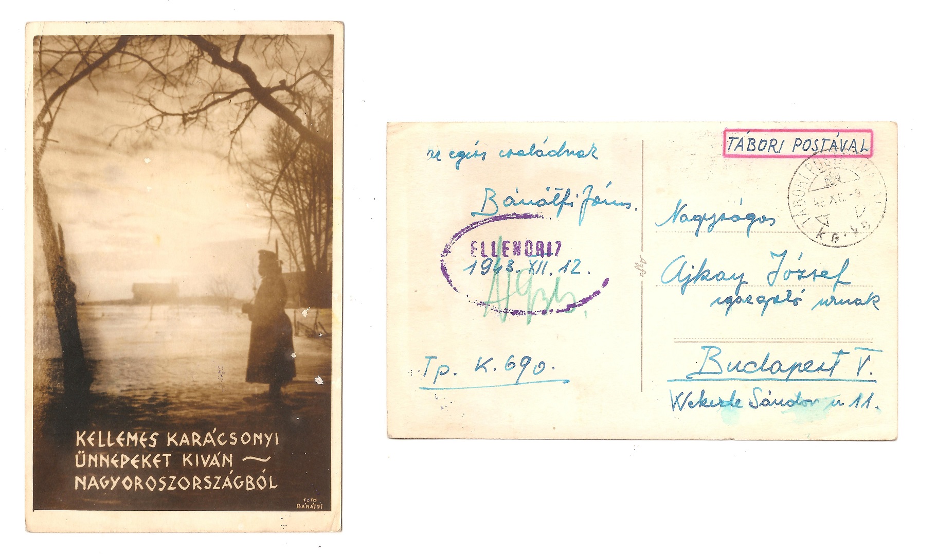 Háborús karácsonyi üdvözlet ez az alábbi, tábori postával feladott fotóképeslap. A lap fényképének készítője és feladója egy bizonyos Bánátfi János volt, címzettje pedig egy bizonyos Ajkay József igazgató. Talán az az Ajkay (Achtzehner) József (1898– ?), aki országos cserkészvezetőként, szövetkezeti igazgatóként volt ismert, Bánátfi János pedig talán az a Bánátfi János (1912–1990) képzőművész, aki Ausztria és Franciaország után hosszabb ideig Brazíliában, azután az Egyesült Államokban, Kaliforniában működött, majd San Diegóban hunyt el. Kellemes karácsonyi ünnepeket Nagyoroszországból kívánt Bánátfi 1943. december 12-én. A kép valahol Oroszországban készült, egy havas, ködös tájban strázsáló honvédet örökített meg rajta Bánátfi.
