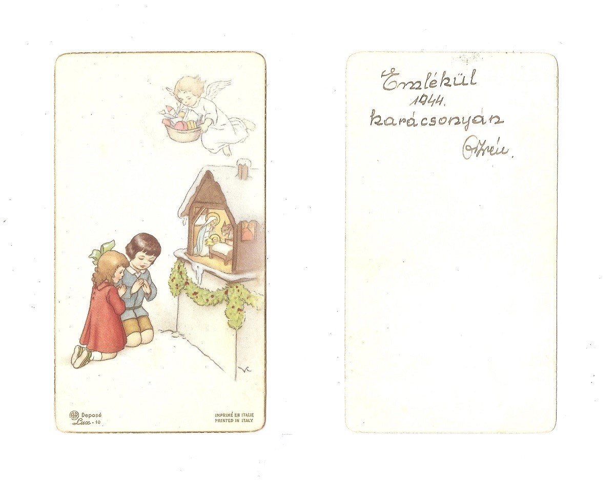 Szintén háborús időkből, 1944-ből való ez a karácsonyi témájú, olasz nyomtatású kiskép. A színes grafikán a betlehemi jászol-makett előtt térdeplő, imára kulcsolt kezű gyermekek, felettük halványabban – szinte gondolatszerűen megjelenő –, felhőn érkező, kezében karácsonyi ajándékokat hozó angyallal. Az angyal a bibliai Újszövetségben az örömhír hozója; alakja innen került a karácsonyi ajándékhozók és a karácsonyfa díszei közé is.