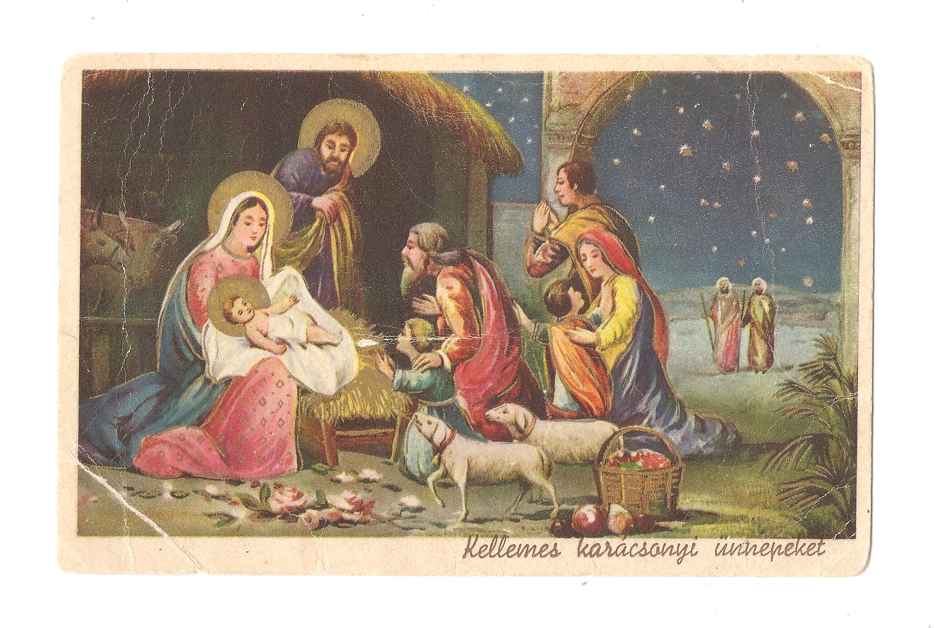 A karácsony vallásos tartalmát, a hagyományosan hozzá kapcsolódó bibliai jelenetet – a Jézus előtt hódoló egyszerű pásztorembereket – ábrázolja ez a színes, aranyozott nyomatú képeslap, szintén a múlt század első feléből, melyet még anyai nagyanyámtól kaptam. A lapot látva szinte megelevenednek előttünk Lukács evangéliumának sorai (Lk 2,15–20):