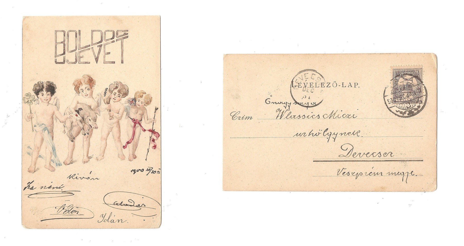 Az elsőt Tatáról adták postára 1900. december 30-án, mely az év utolsó napján, december 31-én már kézbesítődött is egy bizonyos Wlassics Miczi úrhölgynek, Devecserben. Különlegessége, hogy eredeti, kézzel festett a rajta lévő kompozíció.