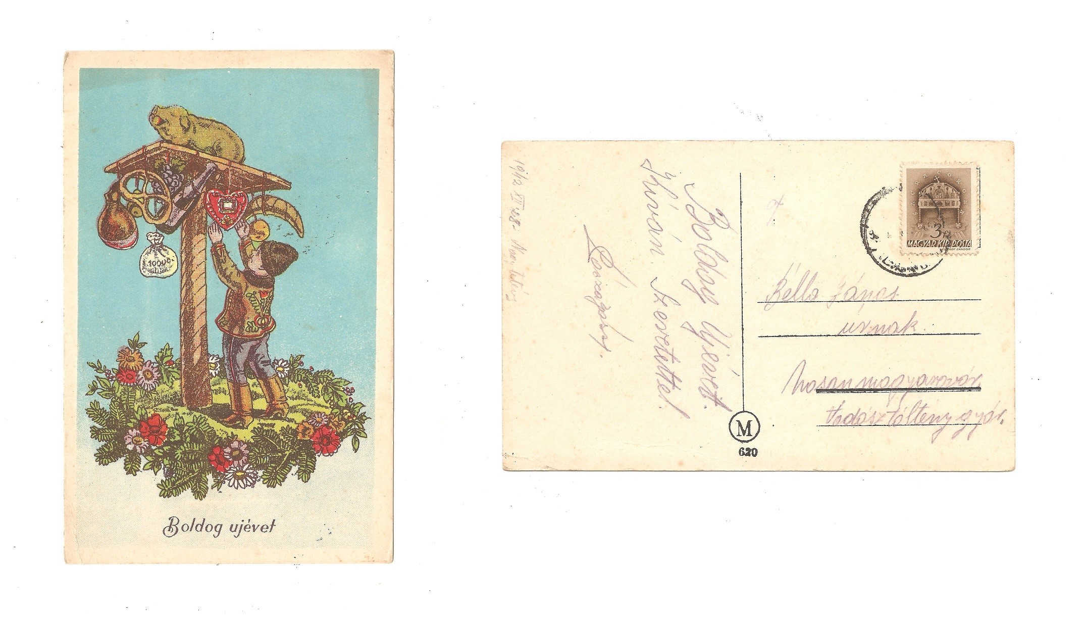 A bőség, a szerencse, a boldogság jelképeit – pl. a malacot, a négylevelű lóherét, a zsákra való pénzt – láthatjuk ezen a két megsárgult képeslapon.
