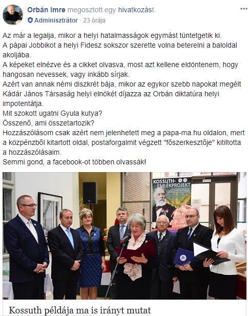 Ellentétben az önnek most oly nagy lelki tusát jelentő önkormányzati rendezvénnyel, a 2017. szeptember 21-i, Kossuth Lajos pápai díszpolgárságának 130. évfordulójával, amely hála Istennek sok-sok, egyáltalán nem párt-politizáló pápai lokálpatrióta-társam közös munkájának segítésével valósult meg; ahol Pápa jelenlegi díszpolgárai, dr. Kövér László és dr. Kovács Zoltán, Pápa jelenlegi vezetői, dr. Áldozó Tamás polgármester, Unger Tamás alpolgármester, Kanozsainé dr. Pék Mária címzetes főjegyző, a pápai Képviselőtestület fideszes tagjai, jobbikos (!), emeszpés, dékás tagja, no meg a Városháza és városunk számos intézményének vezetője, munkása is jelen volt. Szívből sajnálom, hogy ön még Kossuth mellé sem tudott odaállni...
