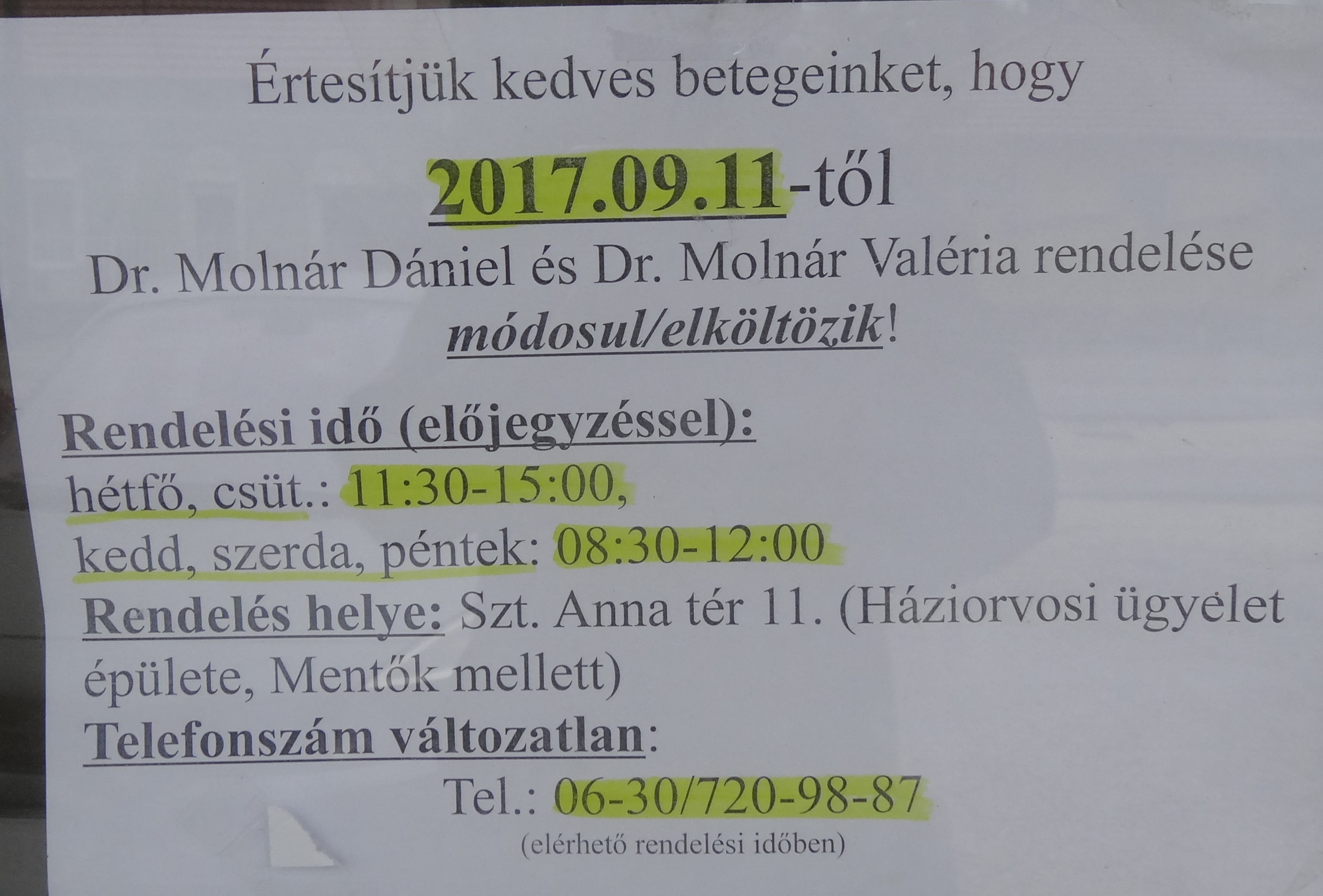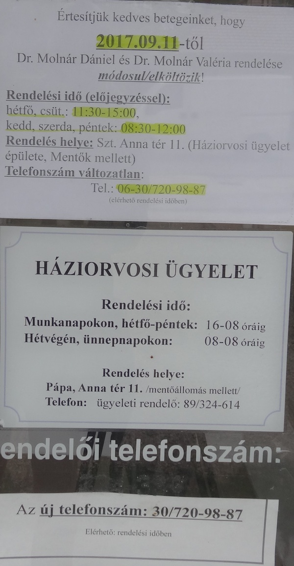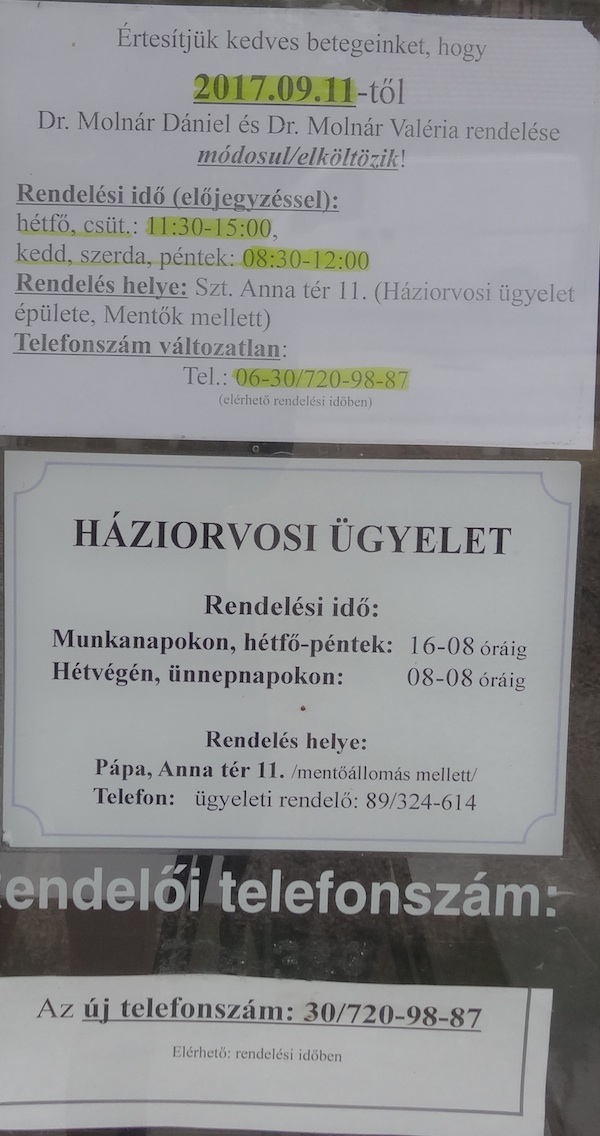 A Huszár lakótelepi orvosi rendelőben felnőtt háziorvosi, gyermek háziorvosi rendelő és védőnői szolgálat is működik. Az épület felújítására 60 millió forintot nyert el a pápai önkormányzat az Európai Uniótól. A munkálatok száz napig tartanak, legkésőbb december 31-én végez a kivitelező. Az épületben praktizáló orvosok és védőnők az alábbi helyeken és rendelési időkben várkák a betegeket: