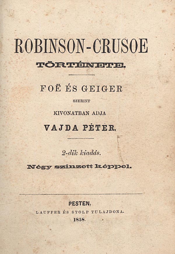 „Robinson Crusoe története. Foë és Geiger szerint kivonatban adja Vajda Péter.”