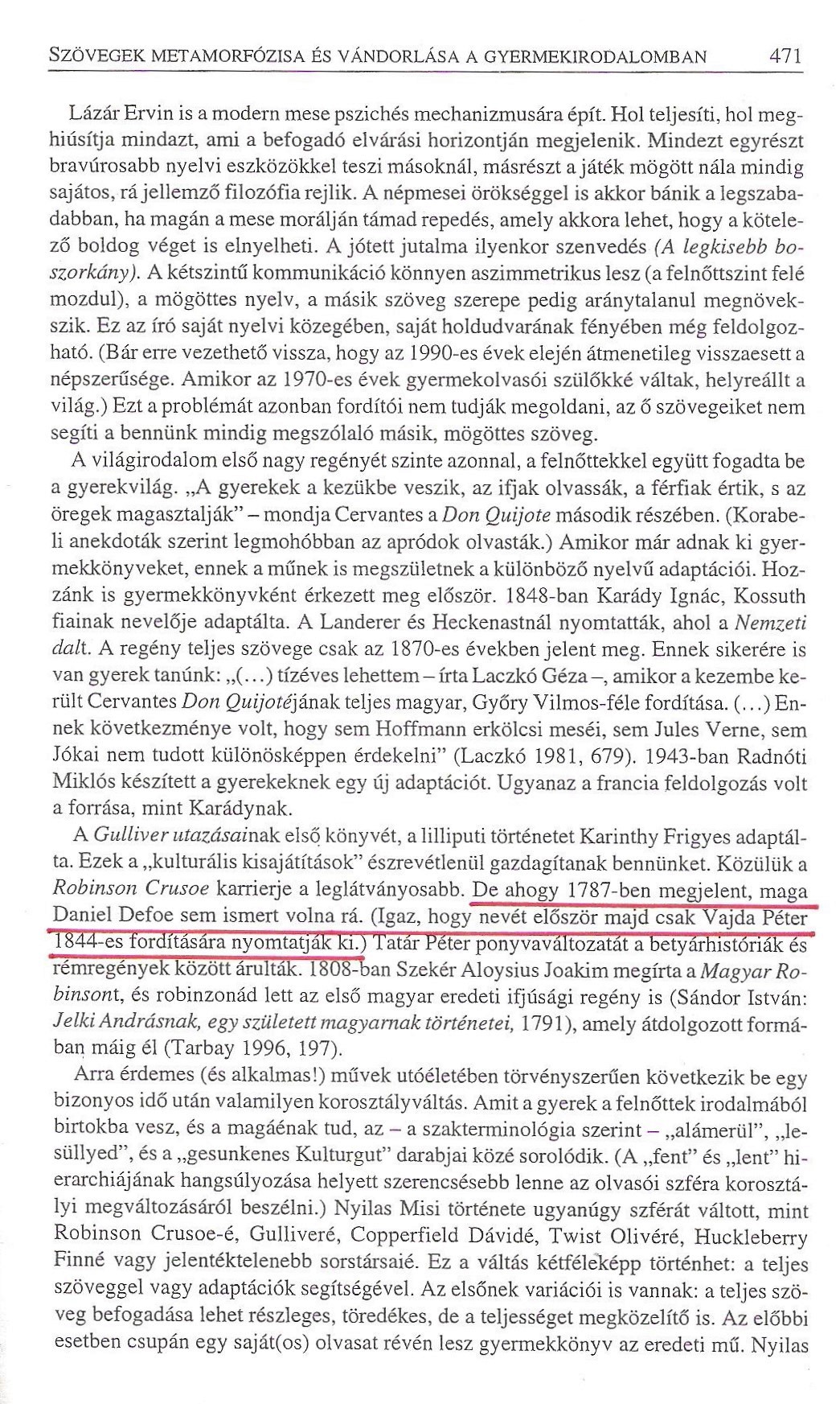 A reformkorban továbbra is számos fordítás jelent meg. (Campe, J. H.: Ifjabbik Robinzon. Mulatságos olvasókönyv gyermekek és ifjak számára. Ford. Uzdi /Vajda Péter/. Pest, 1836.; Robinson Crusoe története. Foë és Geiger nyomán kivonatban adja Vajda Péter. Pest, 1844.) Ami a korábbiakhoz képest előrelépést jelent, az az, hogy a könyvekről megjelent bírálatok nyomatékosan hangsúlyozzák, nagy szükség van értékes »magyar nyelvű gyermekmunkákra« és az, hogy a kevésbé sikerült fordításokat kemény kritikával illetik a korabeli lapok. Felismerve azt a pedagógiai igazságot, hogy a gyermekek kezébe csakis magas színvonalú és nyelvi szempontból is értékes könyveket lehet adni, kritikáikban kiemelték, hogy nemcsak a mű tartalma, hanem a fordítás színvonala is nagyon fontos. A sok rosszul fordított könyv által a gyermekek »nyelvbeli ízlése« romlik, és ez többet rombol, mint amennyit »elméjök és szivök a tartalom által épül.« (Vajda Péter Robinson fordításáról készült kritikából. Athenaeum 1836. II. 147-149.)” (Ezen utóbbi hivatkozást sajnos én nem találtam meg. Úgy tudom, hogy 1837. január 1-jén jelent meg az Athenaeum első száma.)