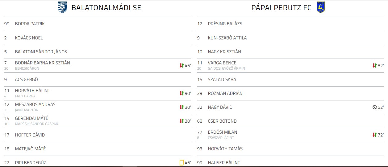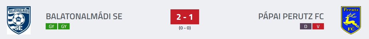 A mérkőzés forgatókönyve hasonlít a Zirc ellenire, Almádiban is a pápaiak szereztek vezetést, ezúttal az 52. percben talált be Nagy Dávid a hazaiak kapujában, ám most is jött a válasz, a csereként beálló Jánó egyenlíteni tudott a 70. percben, majd szintén egy csereember, Bencsik lőtt a pápai kapuba. Ez a találat a 93. percben született, így a pápaiaknak idejük sem lett volna egyenlíteni, a Perutz pont nélkül utazhatott haza Balatonalmádiból.