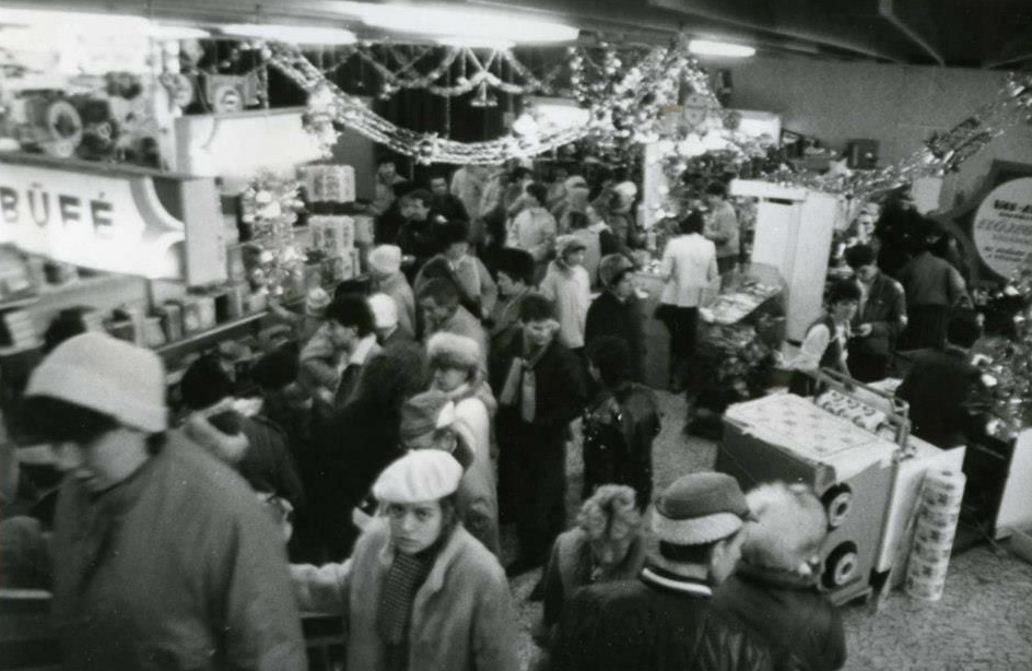 Eredetileg 13 osztályon 66 dolgozóval indult meg a kiszolgálás. A hosszú, üvegezett ablakok mögött többek között óra- és ékszerosztály, műszaki és vasosztály, üveg-, porcelán és konyhafelszerelések osztály, papír-írószer, sport- és játékosztály, méteráru osztály, illatszer és büfé üzemelt. A konfekció részlegen ma már „vintage-retro” fazonnak számító női és férfi ruhadarabok voltak kaphatók. A készletben megjelentek a nyugati kultúrából átvett geometrikus mintájú ruhadarabok, a Fékon, a Vörös Október és a Május 1. által gyártott készruhák. Divat lett a miniszoknya és nejlonharisnya. Idővel kaphatóvá vált a farmervilág egyetlen magyar változata a Trapper is. Ezt a terméket öltönyként is árusították. (Simon Zsolt)