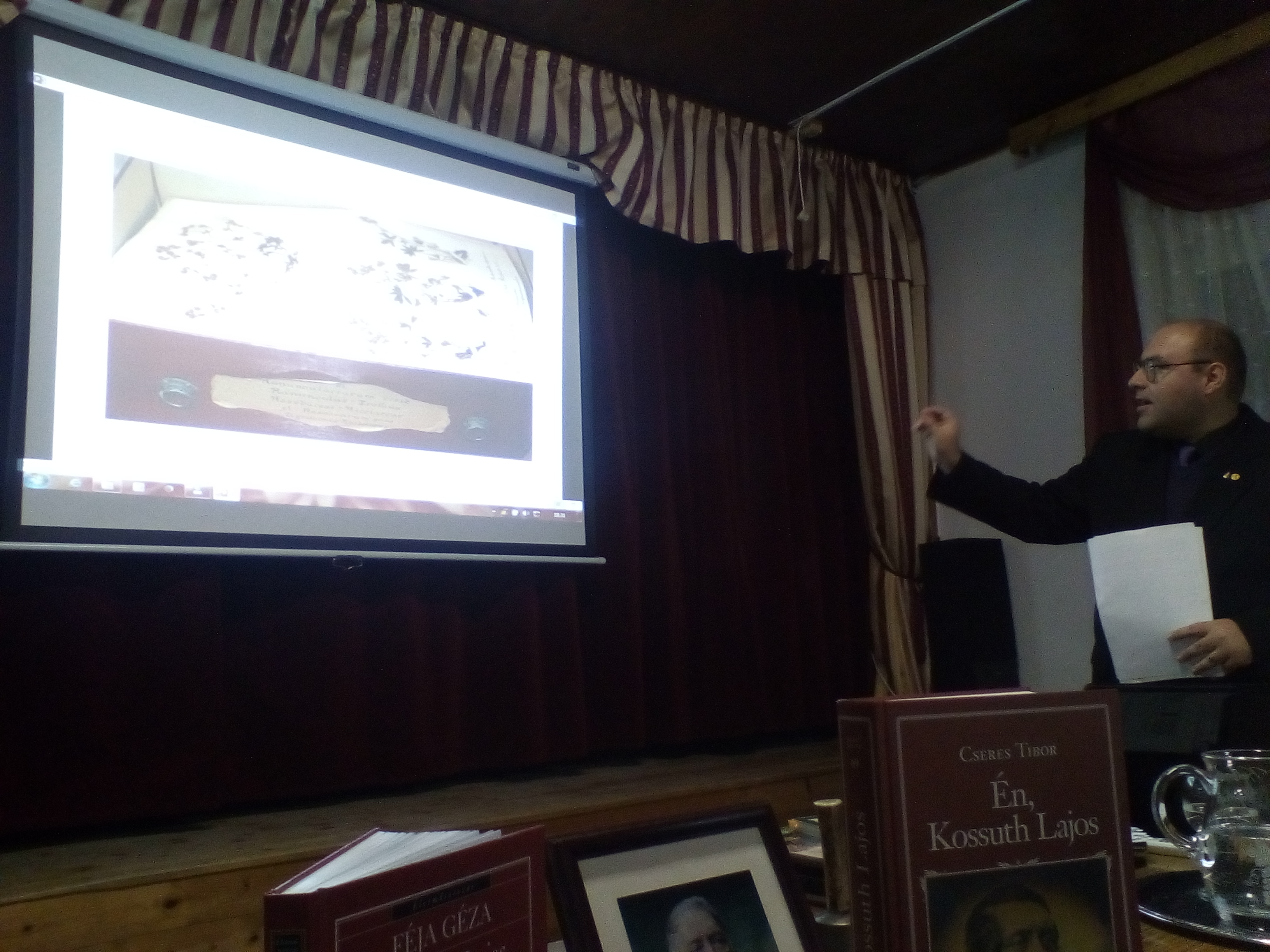 Kerecsényi Zoltán előadásában a Lapok Pápa Történetéből című városi helyismereti-sorozat részeként idén, 2017 szeptemberében megjelent Kossuthos dolgozatát ismertette vetítettképes előadásában a megjelentek előtt. Végigvette Kossuth Lajos életútját, köztük felvillantva rokonságának és baráti szálainak Pápa környéki, s Veszprém megyei kötődéseit. Az előadás keretében külön megemlékezett Kossuthoz köthetően a nagydémi születésű Ihász Dániel és a Gecsén nyugvó Eberhardt Károly honvédezredesekről, az ihászi csata magyar tábornokáról, Kmety Györgyről, aki biztosította menekülését a bukást követően, a pápai, kishegyi kötődéssel bíró Pulszky Ferencről, Kossuth néhai államtitkáráról. Érdekesebbnél érdekesebb képes segédanyag segítségével bemutatta a Kossuth-kultusz jelentősebb emlékeit, az elmúlt több, mint száz esztendő alatt a határon belül, és azon túl, valamint a tengerentúlon létesített Kossuth-szobrokat és emlékműveket.