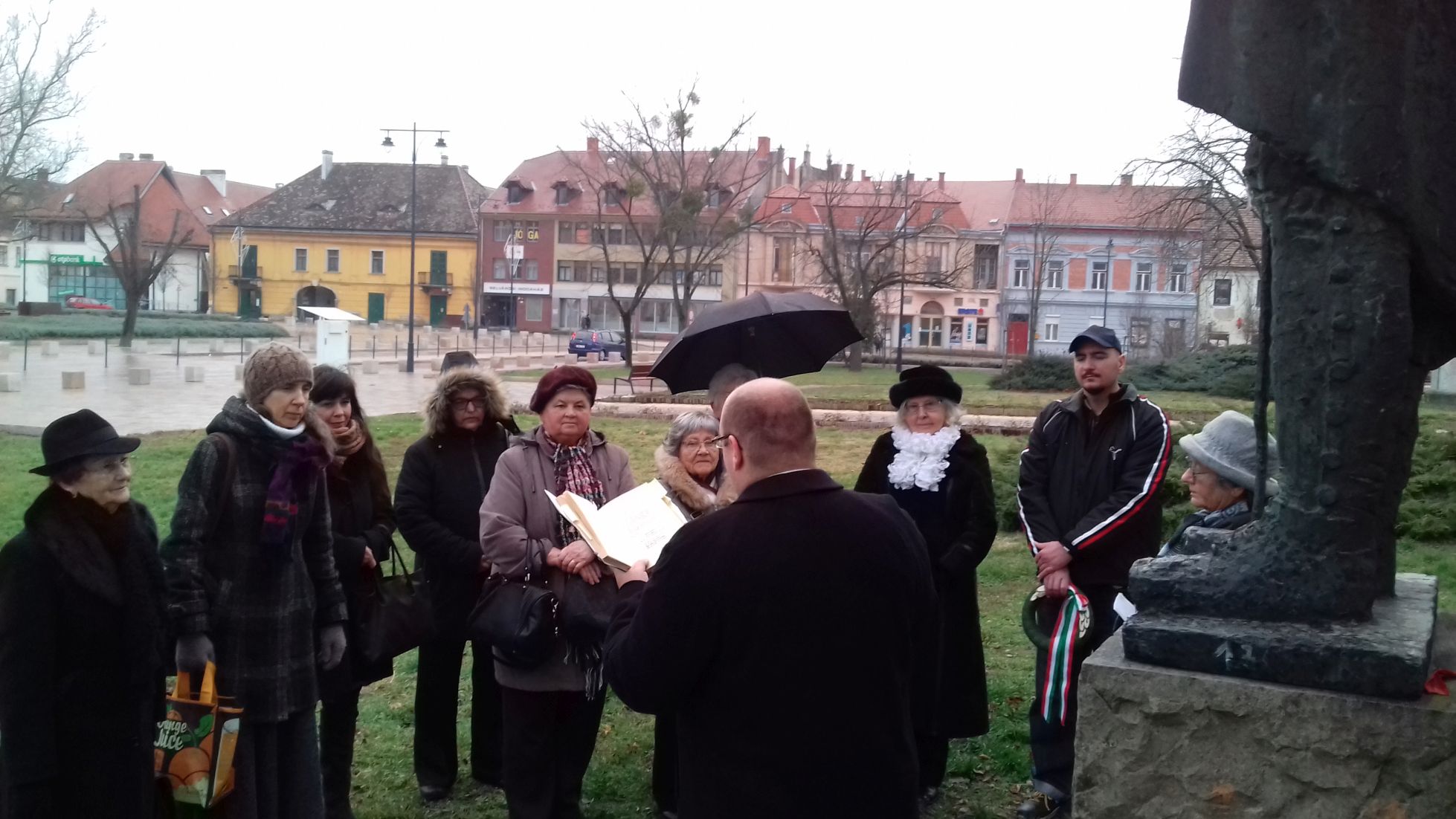 A megjelenteket Vennes Gyöngyi egyleti önkéntes szavalata köszöntötte; aki Petőfi Sándor Újév napján című költeményét olvasta fel. Őt követve, Kerecsényi Zoltán egyleti ügyvivő, pápai önkormányzati képviselő Kolmár József Petőfi Pápán című 1880-as versével üdvözölte a Petőfi-szobor köré gyűlt, megjelent vers-szeretők kicsiny táborát, mert szerinte a vers-szeretet „kaviár” volt mindig, abból kevesen szoktak kanalazni; a verseket sajnos nagyon kevés ember tudja ma is értékelni – majd ehhez kapcsolva osztott meg néhány aktuális gondolatot. Mint mondta, idén van, hogy 195 esztendeje megszületett a magyarság legnagyobb költője, és az idei év az 1848-as forradalom kitörésének kerek 170. évfordulója is, s ez a 170 évvel ezelőtti esemény Petőfi életének csúcspontja is volt, de az igazsághoz tartozik, hogy hatalmas kudarcának, csalódásának is az ideje, hiszen micsoda igazságtalanság (!), ő, a „koszorús népköltő”, a magyar forradalom vezére, jelképe nem lehetett országgyűlési képviselő. Számtalan „rajongója” mellett igen sok irigyes, intrikáló, rosszakaró is körbevette, akik minduntalan azon mesterkedtek, hogy kizárják őt a politikából, hogy ne lehessen képviselő. Ezen cselszövések közepette írta meg a Miért zárjátok el az utamat? című versét.