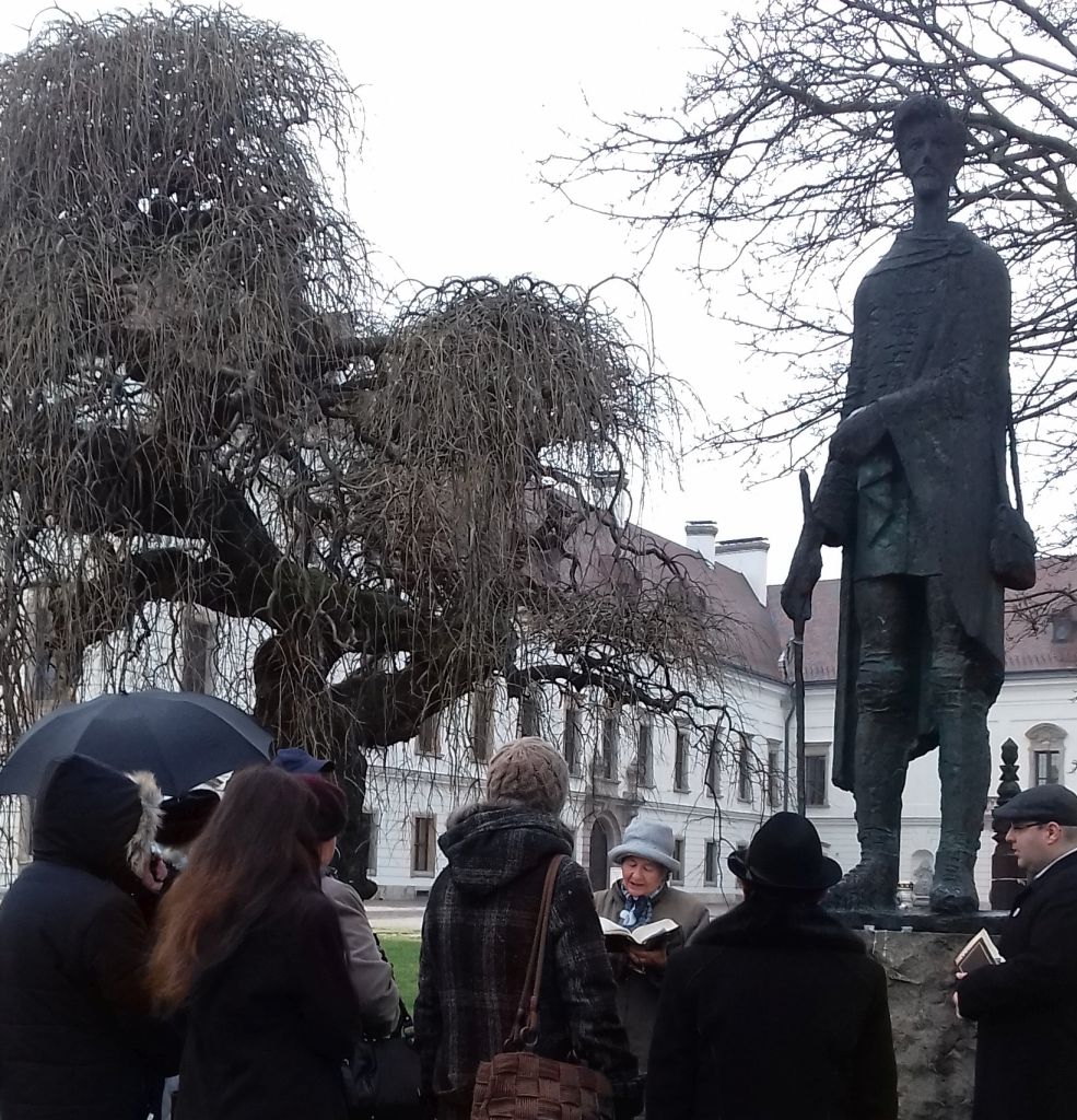 A 195 éve, az 1823-as év legelső napján napvilágra jött „lángszívű” poéta, egykori pápai diák – aki városunkban vette fel a Petőfi nevet (!) – emlékére és tiszteletére az "Elsősorban pápai" Városbarát Egylet (EpVE) hívta rövid főhajtásra, koszorú elhelyezésre az érdeklődőket 2018. január 1-jén kora délután, az idén éppen 45 éve felállított kastély előtti bronzszoborhoz.