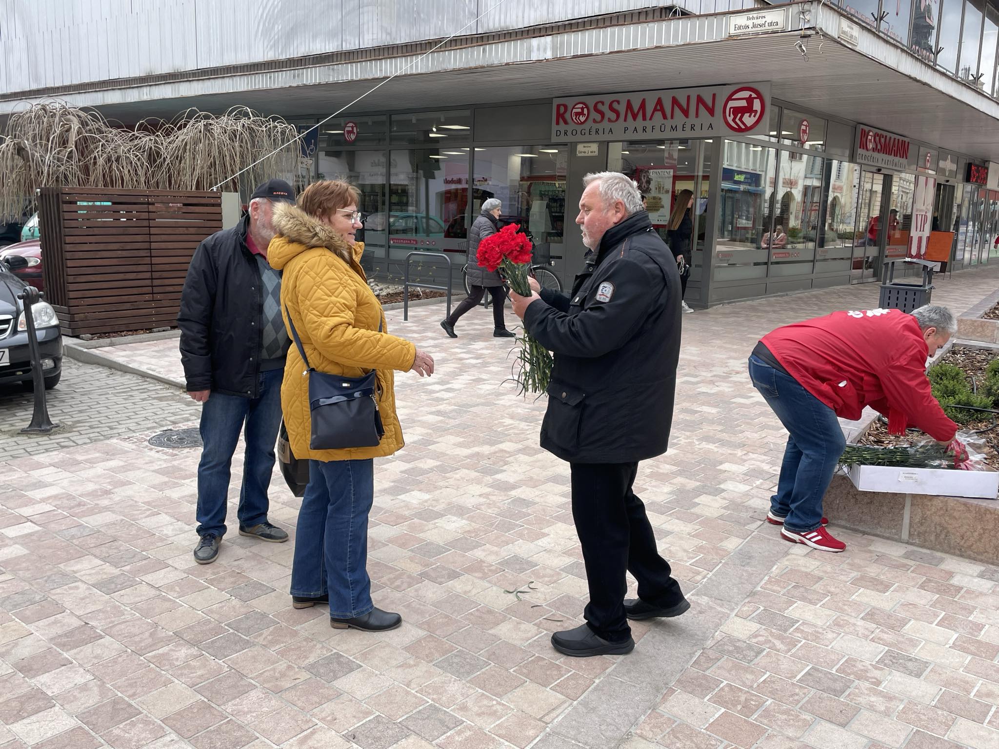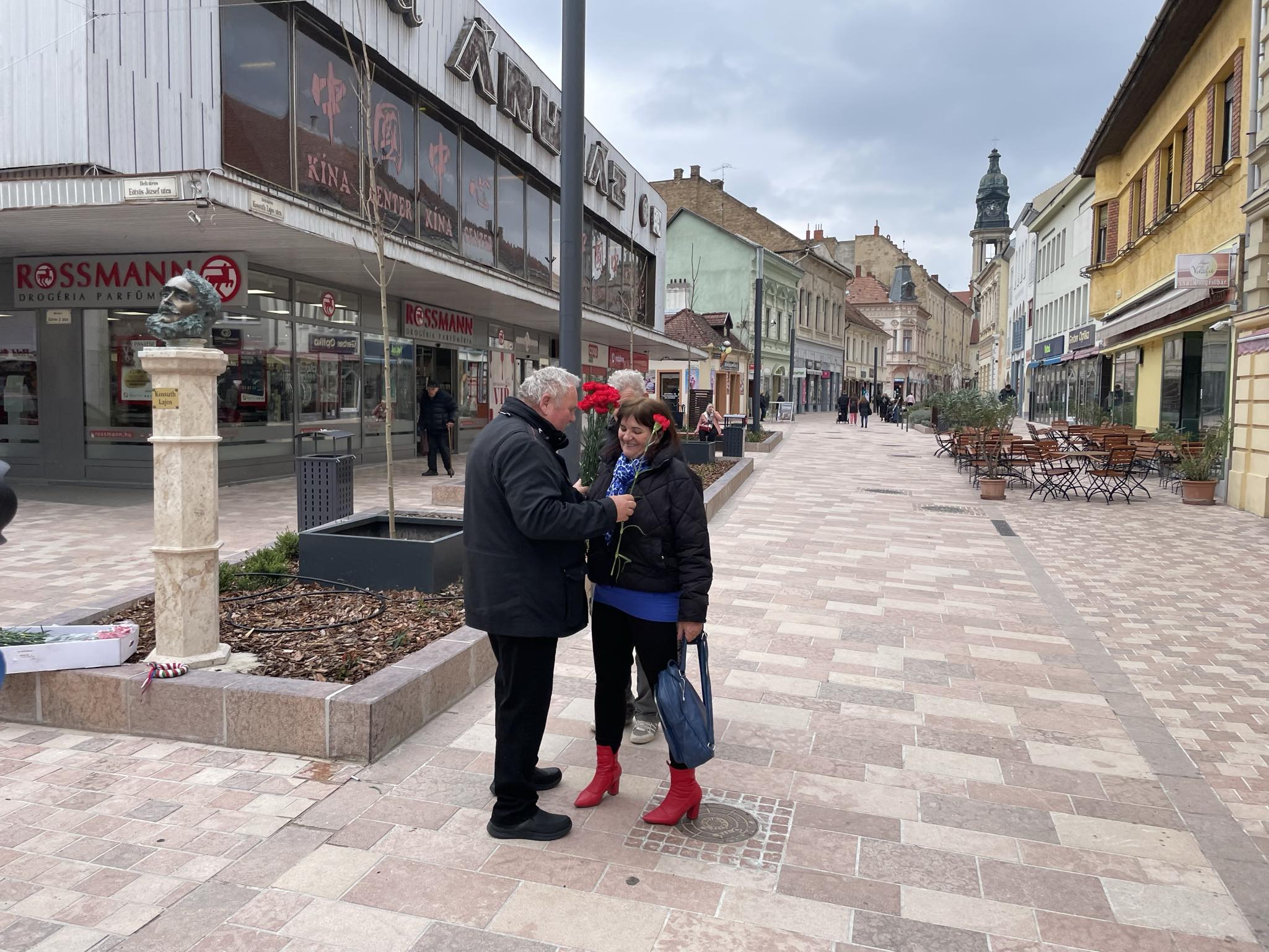 Kovács József és Gőgös Zoltán szegfűvel köszöntötte a nőket a Kossuth utcán