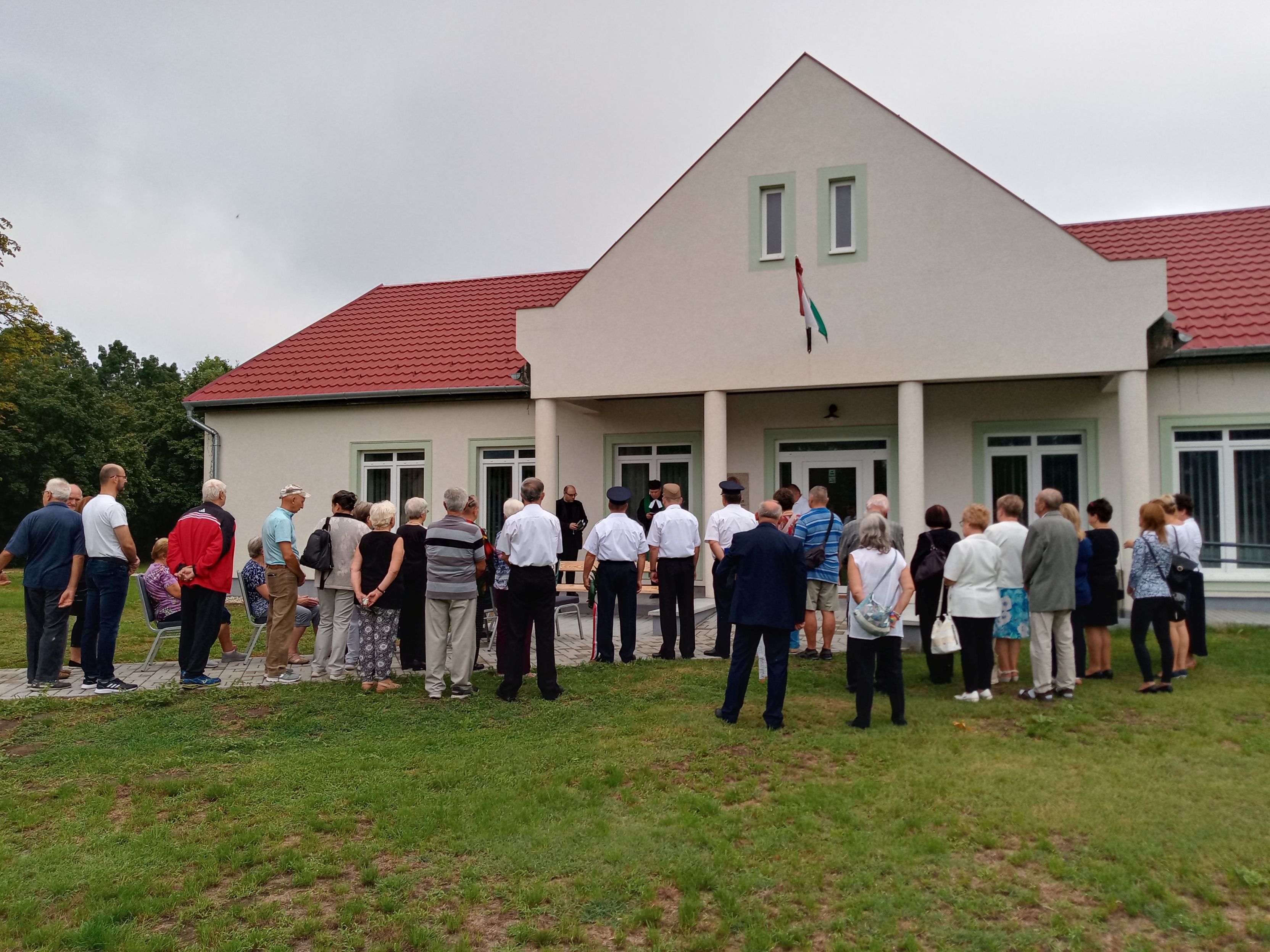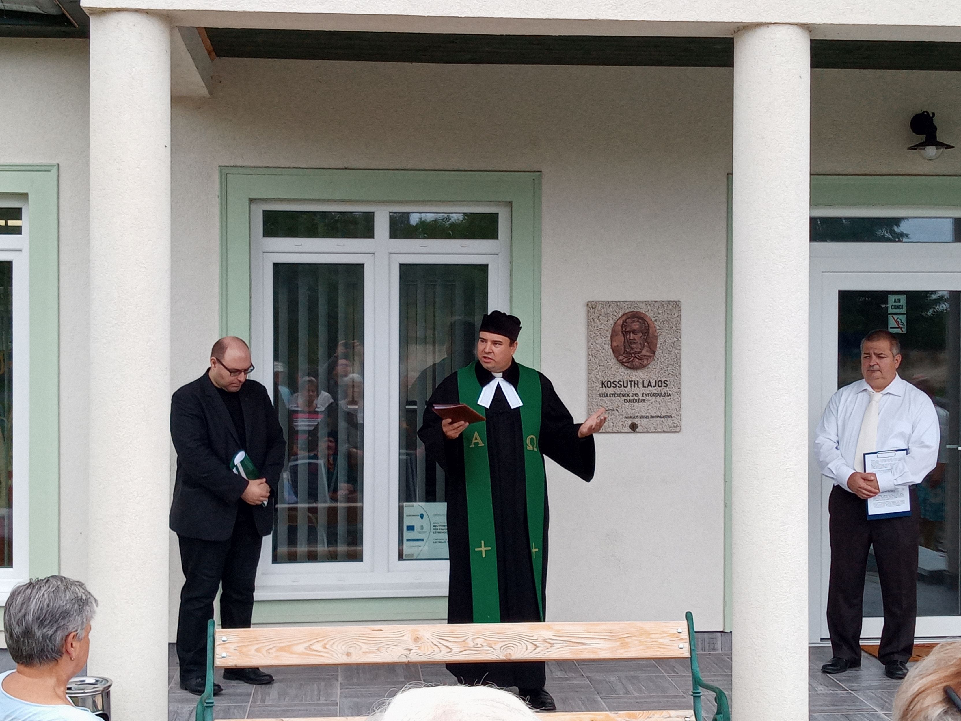 Az ihászi sírkertből a falu közösségi épületéhez vonultak a konferencia résztvevői, ahol Kossuth Lajos portrédomborműves emléktáblájának megáldására került sor. A hajdani magyar kormányzóelnök domborművét – Tóth László balatonalmádi alkotó munkáját – még öt esztendővel ezelőtt, 2017-ben a PVE ajándékozta Ihásznak a civil közösség akkor futó pápai, Pápa környéki Kossuth-emlékprojektje keretében. A márványlapra helyezett, felirattal ellátott emlékjel a közelmúltban példásan felújított közösségi ház főbejáratának egyik oldalán kapott méltó helyet. Eleddigi külön felavatására, megáldására, megkoszorúzására a pandémiás vészidőszak miatt nem kerülhetett sor, ezért most a Kossuth-minikonferencia, s az idei 220. Kossuth-évforduló alkalmából a szervezők megkérték a Malomsoki Evangélikus Egyházközség, illetve a marcaltői Kmety György Evangélikus Általános Iskola és Óvoda lelkipásztorát, Weltler Gábor evangélikus tisztelendőt, hogy áldja meg azt.