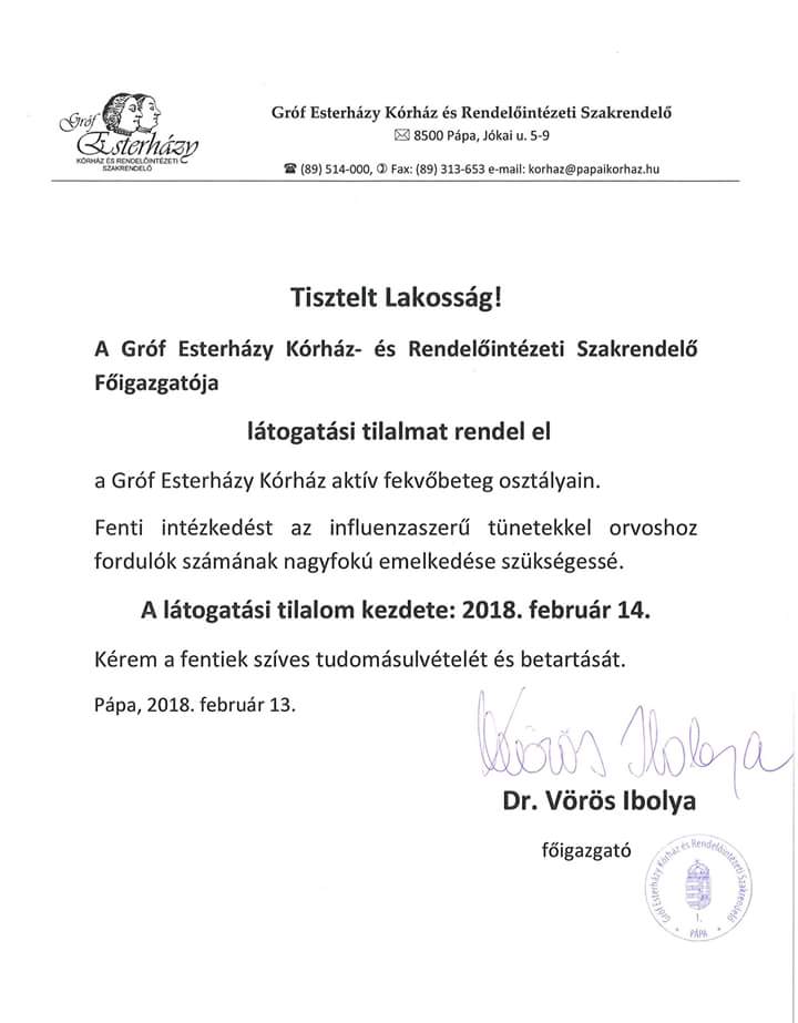 A mai naptól kezdődően látogatási tilalom van érvényben a pápai Gróf Esterházy Kórház aktív fekvőbeteg osztályain - áll a kórház közleményében.