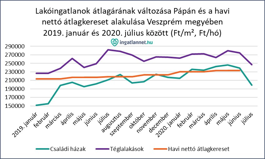 2020 első félévében, a Veszprém megyében kapható havi nettó átlagkeresethez viszonyítva a pápai házakhoz könnyebben hozzá lehetett jutni, mint a lakásokhoz. Idén júliusban ugyanis egy családi ház 200 ezer Ft/m²-es átlagárát még éppen-éppen kifutotta a megyére jellemző havi nettó átlagbér, szemben a lakásokkal. A téglaépítésű lakások átlag négyzetméter ára 250 ezer forint körül alakult a nyár közepén, ami az egy havi átlagkereset nettó értékénél magasabb volt.