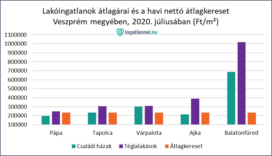 Veszprém megye kisebb városaiban is keveset ér az általunk kijelölt 20 millió forint. Például Balatonfüreden szinte semmire sem elég a keretösszeg. A kedvelt üdülőhely lakóingatlanainak júliusi átlag négyzetméter ára alapján 20 millió forintból egy alig 30 m² alapterületű házat vagy egy 20 m² alapterületű téglalakást lehetett volna vásárolni.