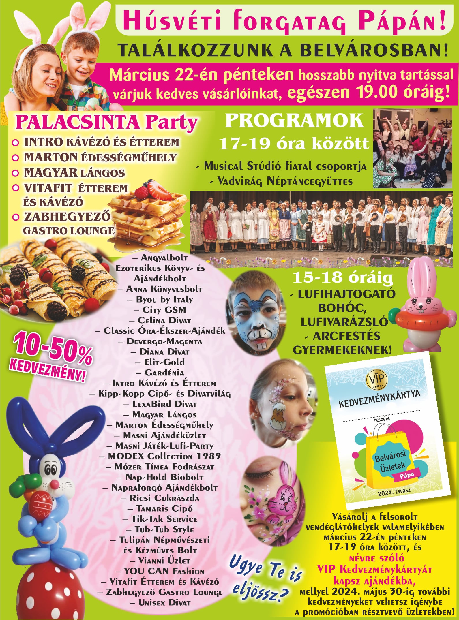 Március 22-én a Húsvétra való készülődés jegyében szerveződnek a programok. A kicsiket lufihajtogató bohóc és arcfestés várja, a színpadi programokról pedig a Musical Stúdió fiatal csoportja és a Vadvirág Néptáncegyüttes gondoskodik. A vendéglátóhelyek ezúttal palacsinta különlegességekkel várják a vendégeket, az üzletekben pedig egyedi kedvezmények csábítanak.