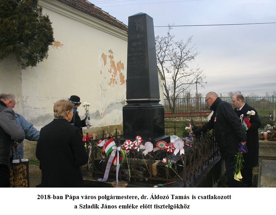 Petőfi Sándor mellett Szladik János emlékének a fenntartása is különösen fontos a számunkra. De nemcsak kizárólag negyvennyolcasként példa ő. (Nevét nem véletlenül viseli az EpVE-n belül működő kis „Szladik János Karitatív Sejt”, mely a látókörébe került-kerülő rászorulók tartósélelmiszerekkel való megsegítésére szokott gyűjteni.) Kivételes szorgalommal – még autodidakta módokon is képezve magát –, kőműves munkásemberből lett a helyi posta- és távíró hivatali főnöke. Azonban magas tisztségbe érve sem feledkezett el arról, hogy honnan jött; bőkezű pápai polgárként segített, ahol csak tudott. Nagy szív és lélek lakozott benne, vagyonának jelentős részét keresztény árvaház létesítésére adományozta, de adományokat tett más szociális intézmények javára is. Végrendeletében Barát utcai lakóházát is a városra hagyta. (E ház jelenleg is szociális célokat szolgál Pápán.) Legendás alakját „mindenki tutoraként” emlegetve a méltatlanul elfeledett, pápai fölmenőkkel bíró író-költő, Somogyváry Gyula is megörökítette „A pirossapkás kislány” című művében. Jótéteményei elismeréseként, továbbá a szabadságküzdelemben való részvételéért, halálának tizedik évfordulóján, 1903-ban egy pápai utcát (az 1886 és 1902 között „Térj meg” utcaként ismert utcát) Szladik János utcának nevezett át a városvezetés. Ma is ekképp viseli a nevét. Díszes, kovácsoltvas kerítéssel védett, gyönyörű fekete gránit síremlékét évről-évre, március idusához közelítve a pápai Szent István Római Katolikus Általános Iskola diákjai és kis egyletünk önkéntesei koszorúzzák a Kálvária-temetőben. (Szladikról – Somogyváry említett művéből vett idézetekkel – a 2018. március 15-re közreadott ünnepi, egyleti kiadványunkban, a „’48-as Zsebfüzetben” is külön megemlékeztünk.)