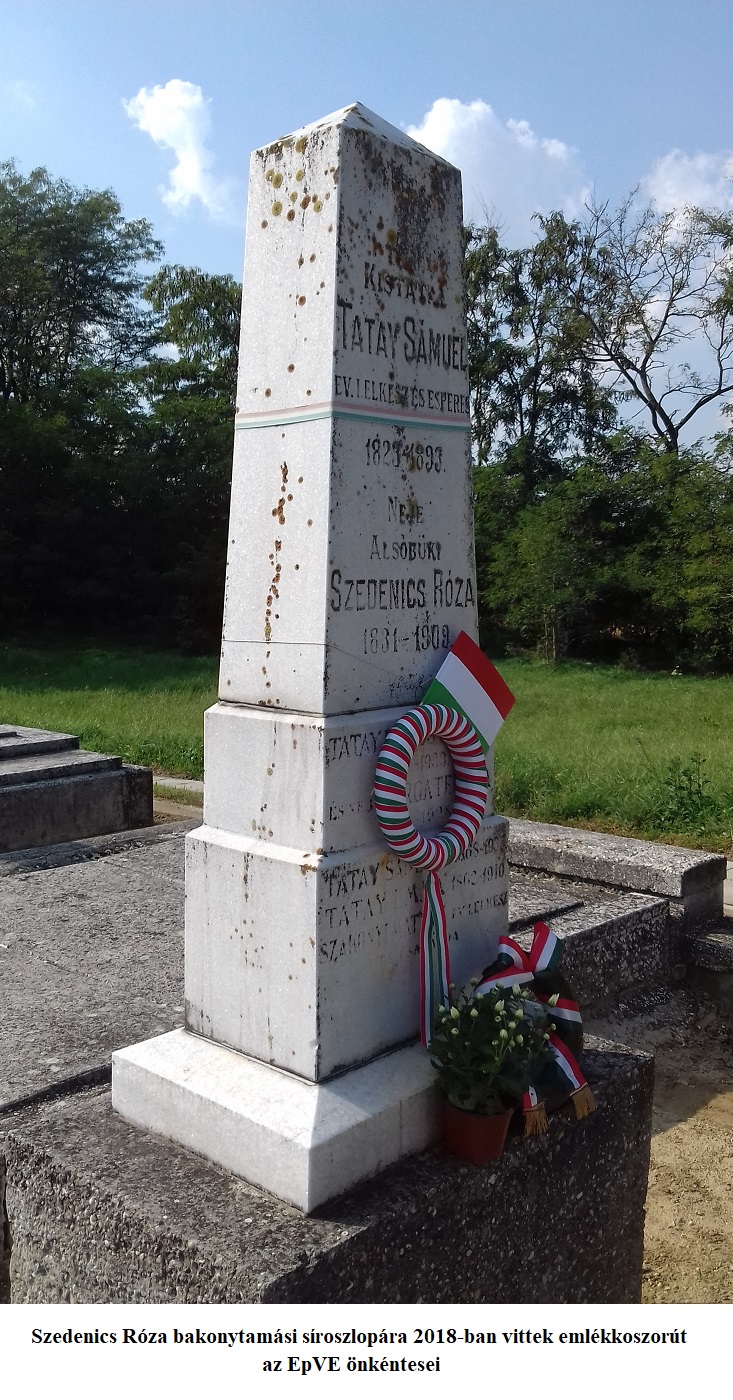 A 2021-ben 190. születési évfordulós Alsóbüki Szedenics Róza (1831–1909) a Veszprémi Evangélikus Egyházmegye hajdani esperesének, a kitűnő egyházi szónoknak, várpalotai lelkipásztornak, Szedenics Györgynek a leánya volt. 1849-ben kötött házasságot a bakonytamási lelkész, nemzetőr Tatay Sámuellel. Tíz gyermekükből hat, négy lány és két fiú maradt életben. Közülük Lajos követte Tatay Sámuelt a papi pályán a bakonytamási gyülekezetben. Szedenics Róza fiatal nőként aktívan vette ki részét az 1848/49-es magyar szabadságügyből, hírvivői szerepeket vállalva. De a ’48-as eszmékért „haláláig csatázó” asszony hírében állt; elhunytáig hű maradt a polgári forradalom és szabadságharc emlékéhez. A róla elnevezett emlékplakett átnyújtásával a tavaly elhunyt Fejes Lajosné szül. Tatay Terézia emlékének is adózni kíván a Kossuth Szövetség megyei csoportjaként is működő Elsősorban pápai Városbarát Egylet. Fejes Lajosné szül. Tatay Terézia dédnagyanyja volt Szedenics Róza. Fejes Lajosné Tatay Teri néni hosszú élete során mindvégig büszke volt családja Kossuth Lajos kormányzóelnök nevét viselő bakonytamási csárdájára, annak 1989-es rendszerváltoztatás utáni újralétesítésére, s gondos szeretettel óvta evangélikus hitű, nagy magyar elődei emlékét. Mindig őszinte örömmel mutatta meg érdeklődő látogatóinak az otthonában féltve őrzött eredeti Kossuth és Tatay képeket. Évről évre rendszeres résztvevője volt a bakonyság-csárdapusztai Kossuth-kápolnánál szervezett március idusi főhajtásoknak, elkötelezett támogatója, segítője volt Pápa és környéke kossuthos hagyományőrzésének, községe honvédhősi nyughelyei ápolásának; családjuk egykori lelkes barátja, H. Szabó Lajos pápai helytörténész kezdeményezéseinek, a Kossuth Szövetség Veszprém megyei ügyeinek. De nemcsak a hagyományőrzés területén jeleskedett, kiváló pénzügyi szakemberként, nagyon nehéz körülmények között is megállta a helyét. Gyermekeit munkára és becsületre nevelte, rendszeres családi találkozókat szervezett, mindent elkövetett összetartozásuk erősítése érdekében. Szülőfaluja közéletének meghatározó egyénisége volt Szedenics Róza XX. század végi – XXI. század eleji méltó utódjaként.