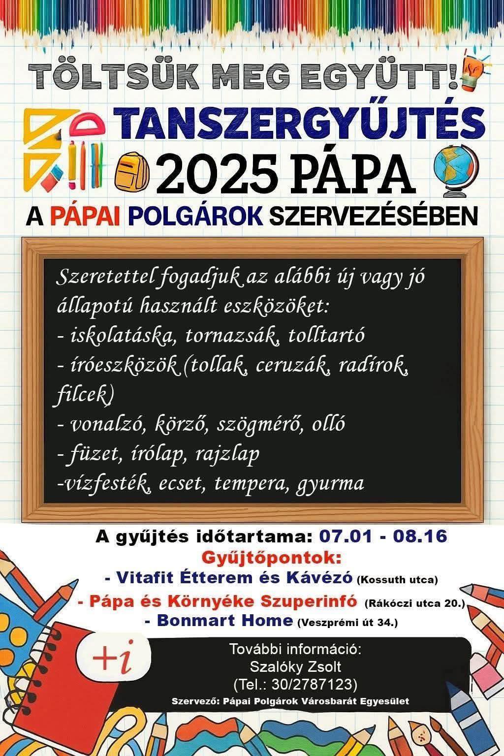 A Pápai Polgárok több jótékonysági és városszépítő akcióval vétették már észre magukat. Ezúttal az iskolakezdésre készülve, tandszergyűjtő akciót indítottak. A felajánlásokat három helyszínen, a Szuperinfó Rákóczi utcai irodájában, a Vitafit Étteremben és a Bonmart Home Veszprémi úti üzletében lehet leadni. Mindhárom helyszínen szép számmal gyűlnek az adományok, melyek között vadonat új és jó állapotú használt tanszerek is vannak.