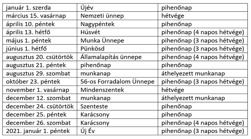 Munkaszüneti napok és munkanapok 2020-ban