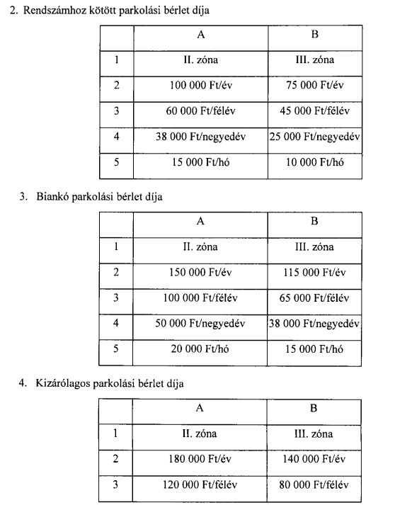 Nézzük a bérletárakat (50% kedvezmény jár azoknak, akiknek az adott zónában van ingatlanjuk és ott is laknak, illetve ha az ingatlanjukon nem tudják tárolni a kocsit)