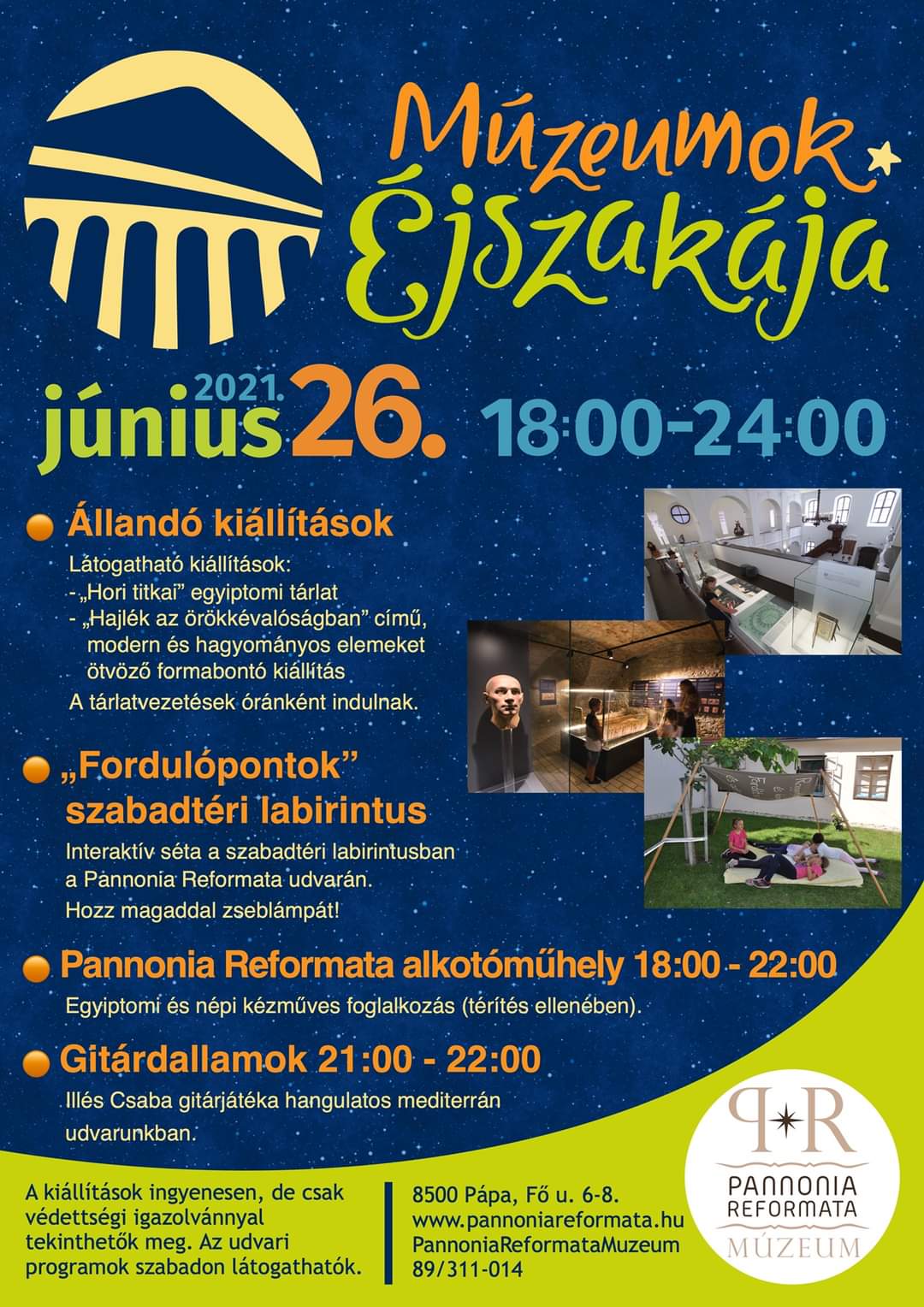 A Pannonia Reformata Múzeumban az állandó kiállítások mellett szabadtéri labirintus, alkotóműhely és gitárkoncert szerepel a kínálatban.