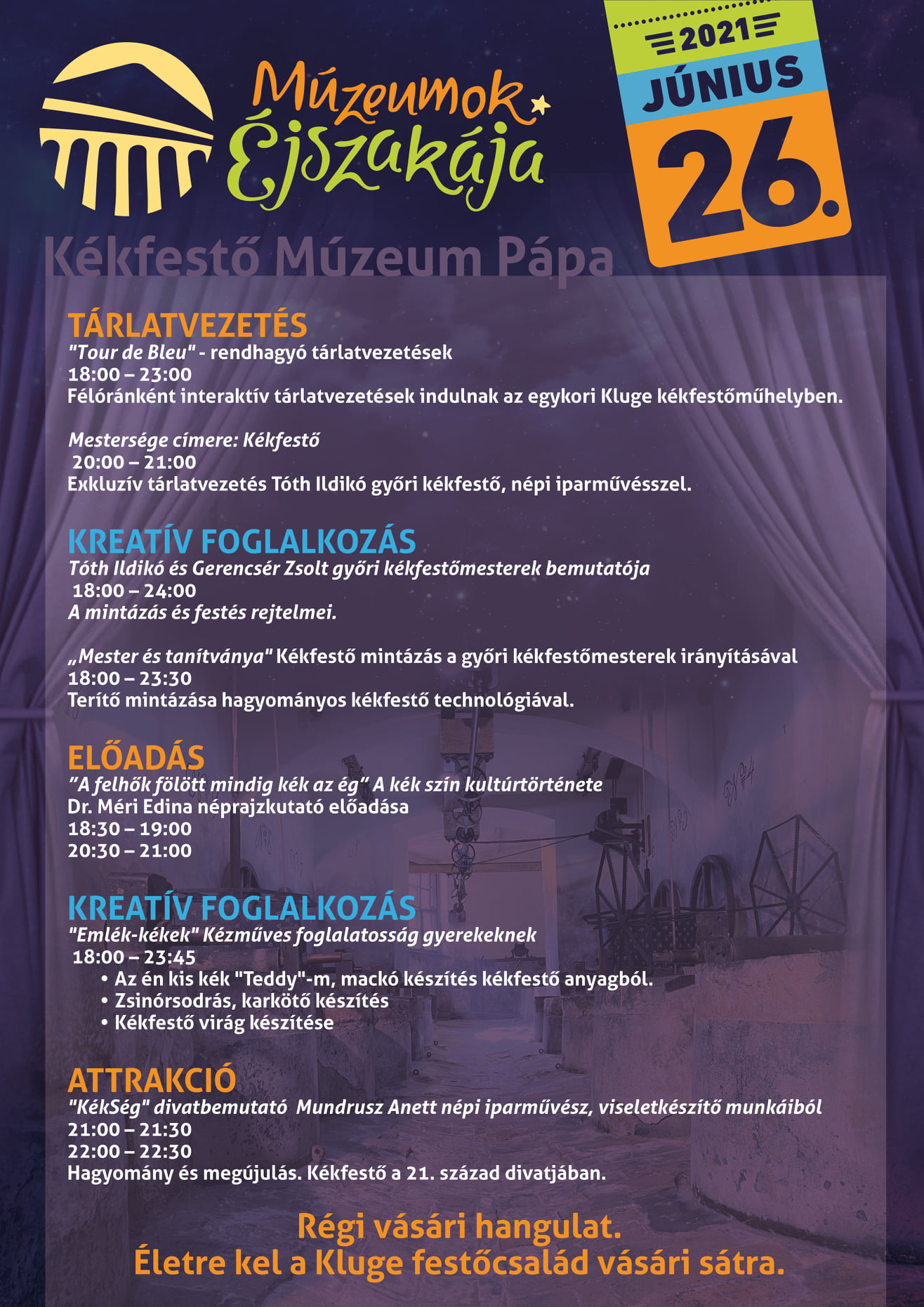 A Kékfestő Múzeumban 18 órától indulnak a rendhagyó tárlatvezetések, fél óránként. Tóth Ildikó és Gerencsér Zsolt népi iparművészekkel a kékfestés mesterségével lehet megismerkedni, kreatív foglalkozások keretében. A felhők fölött mindig kék az ég címmel dr. Méri Edina néprajzkutató tart előadást a múzeumban, 18:30-tól, és 20:30-tól, de a Kékfestő Múzeumban is lesz kézműves foglalkozás, teddy mackót, karkötőt és kékfestő virágot lehet majd készíteni, de kékfestő divatbemutató is lesz, Mandrusz Anett népi iparművész munkáiból kaphatnak ízelítőt az érdeklődők.