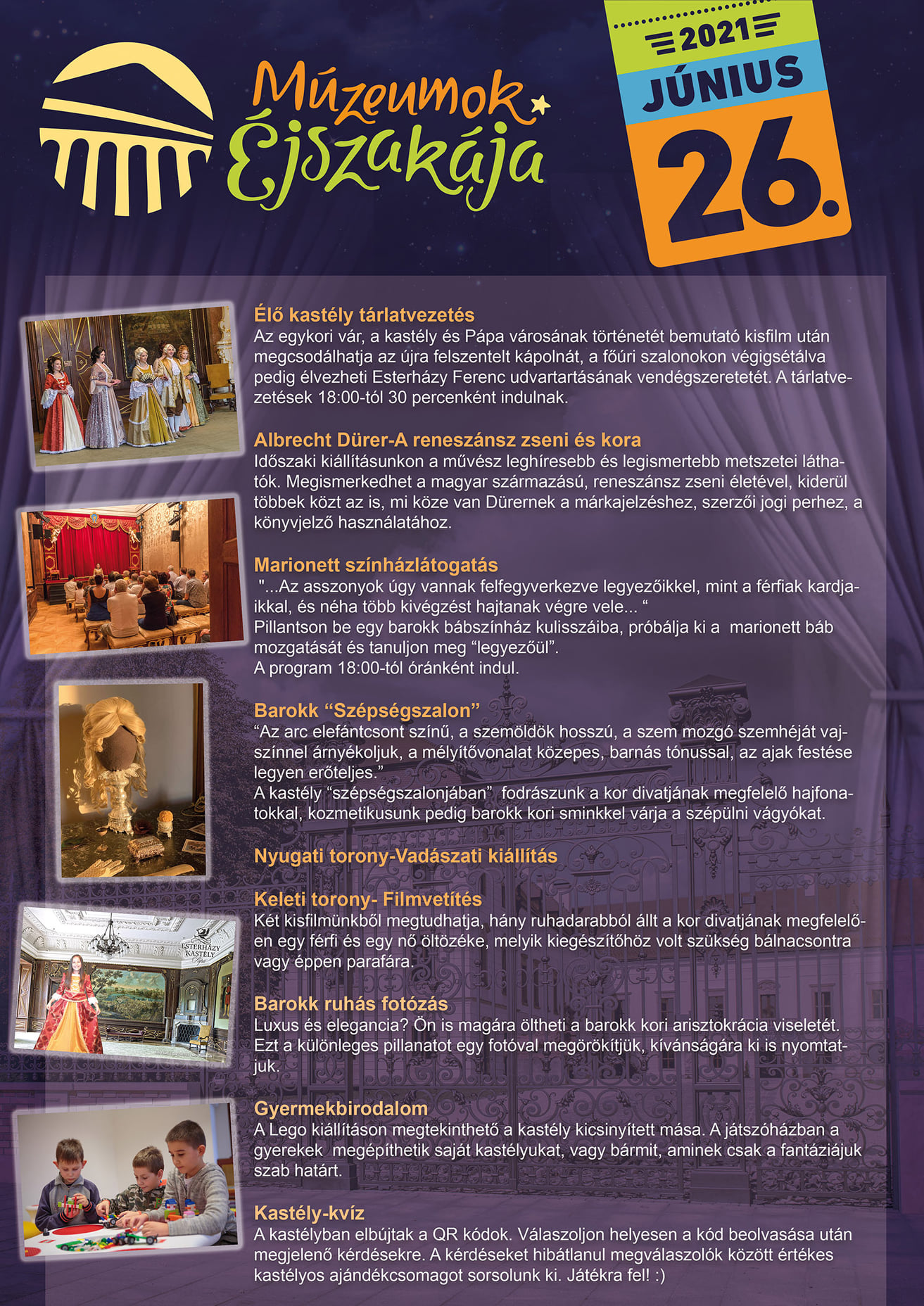 Az Esterházy-kastély szintén 30 percenként várja tárlatvezetéssel a látogatókat. A tavalyi év után idén is megtekinthető Albrecht Dürer időszaki kiállítása, a marionett színház és a gyermekbirodalom, de barokk ruhás fotózásra is lesz lehetőség. A barokk szépségszalonban sminkes és fodrász várja majd a szépülni vágyókat, a kastély nyugati tornyában pedig vadászati kiállítást rendeznek be, amely már a Múzeumok Éjszakáján is megtekinthető lesz. A szervezők játékkal is készülnek, QR kódokat rejtenek el a kastélyban, amelyek egy-egy kérdést rejtenek. A jól válaszolók ajándékcsomagokkal gazdagodhatnak.