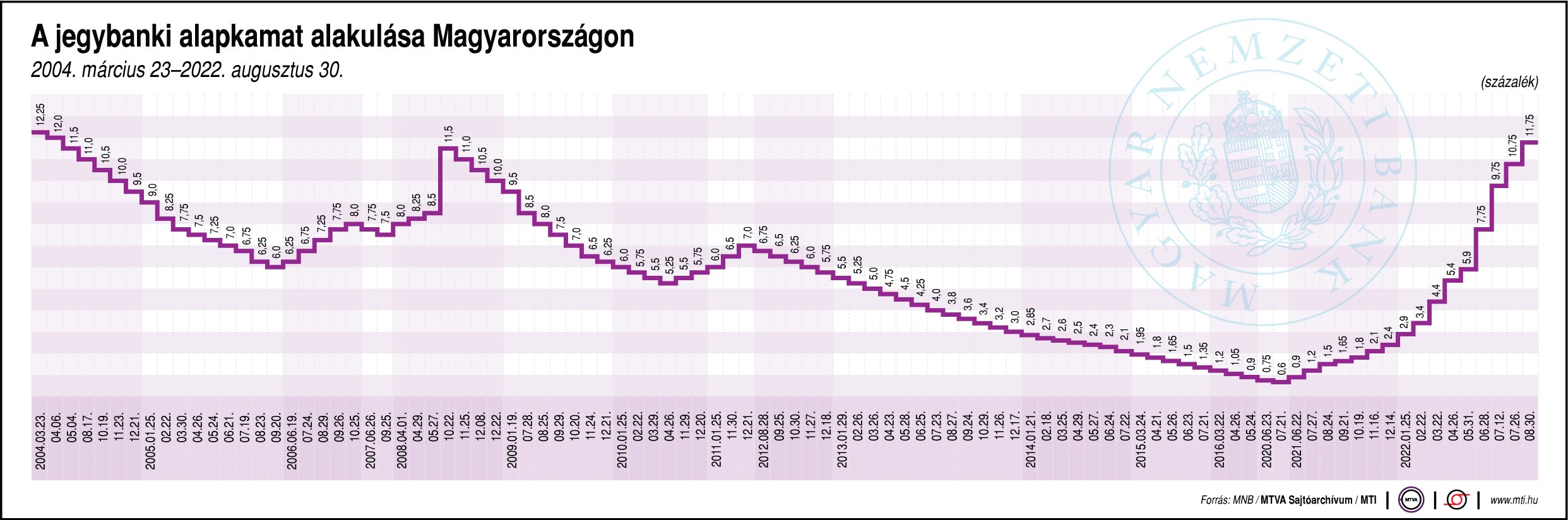 Az alábbi ábrán jól látszik, hogy ilyen magasságban még a 2008-as világgazdasági válság után sem járt az alapkamat Magyarországon, még a Medgyessy-kormány idején volt 12 % felett.