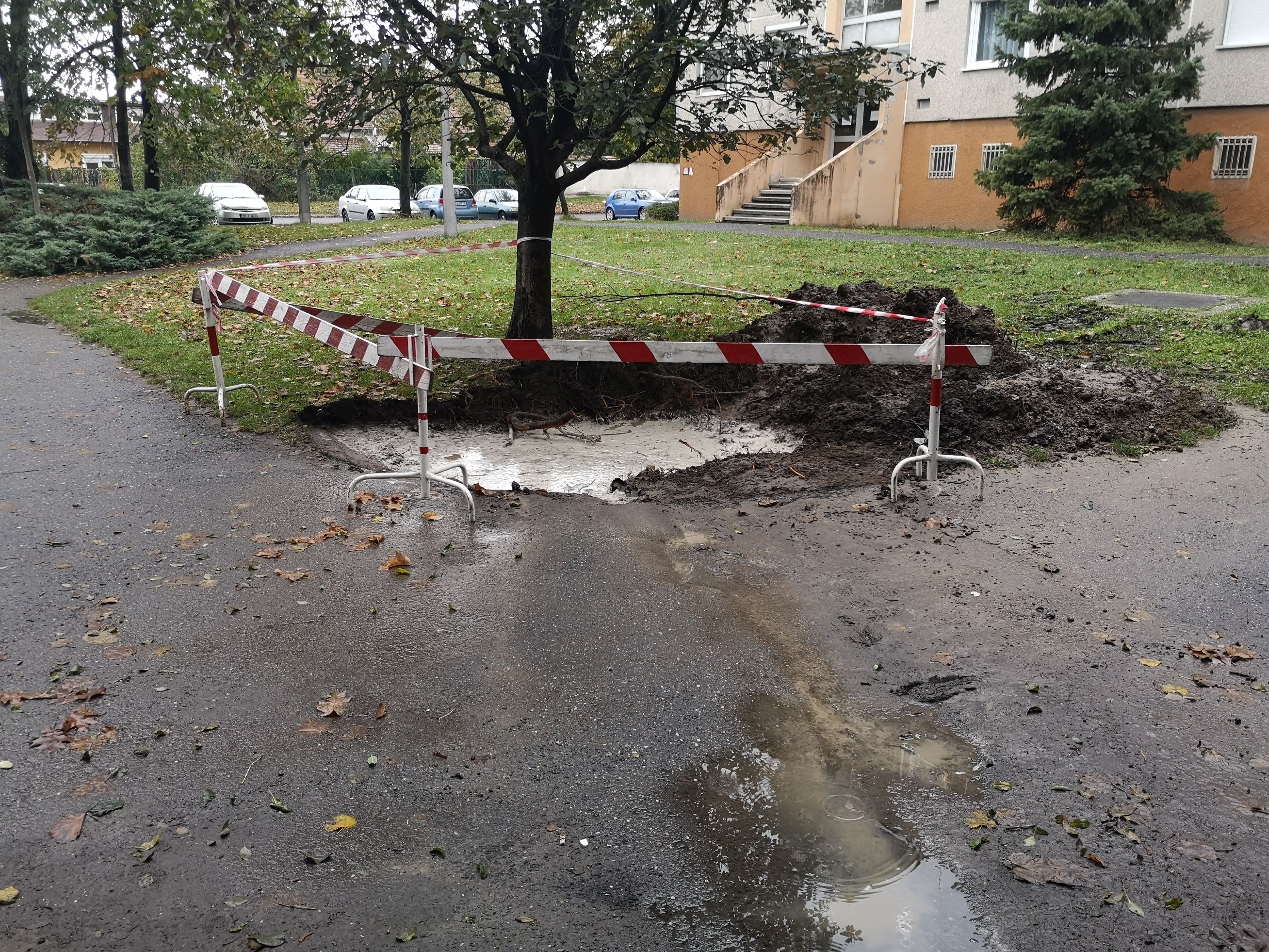 A víznek ástak egy jókora gödröt, amit szerencsére bekerítettek, nehogy egy gyanútlan óvodás pocsolyának nézze. Azt tervezik, hogy a gödröt kaviccsal töltik majd fel, így oda máskor is elfolyhat a víz.