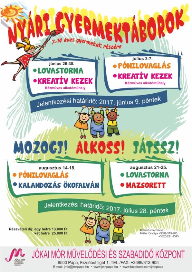 A Jókai Mór Művelődési és Szabadidő Központ minden általános iskolás korú gyermek jelentkezését várja. Az első két turnusra a nevezési határidő június 9.