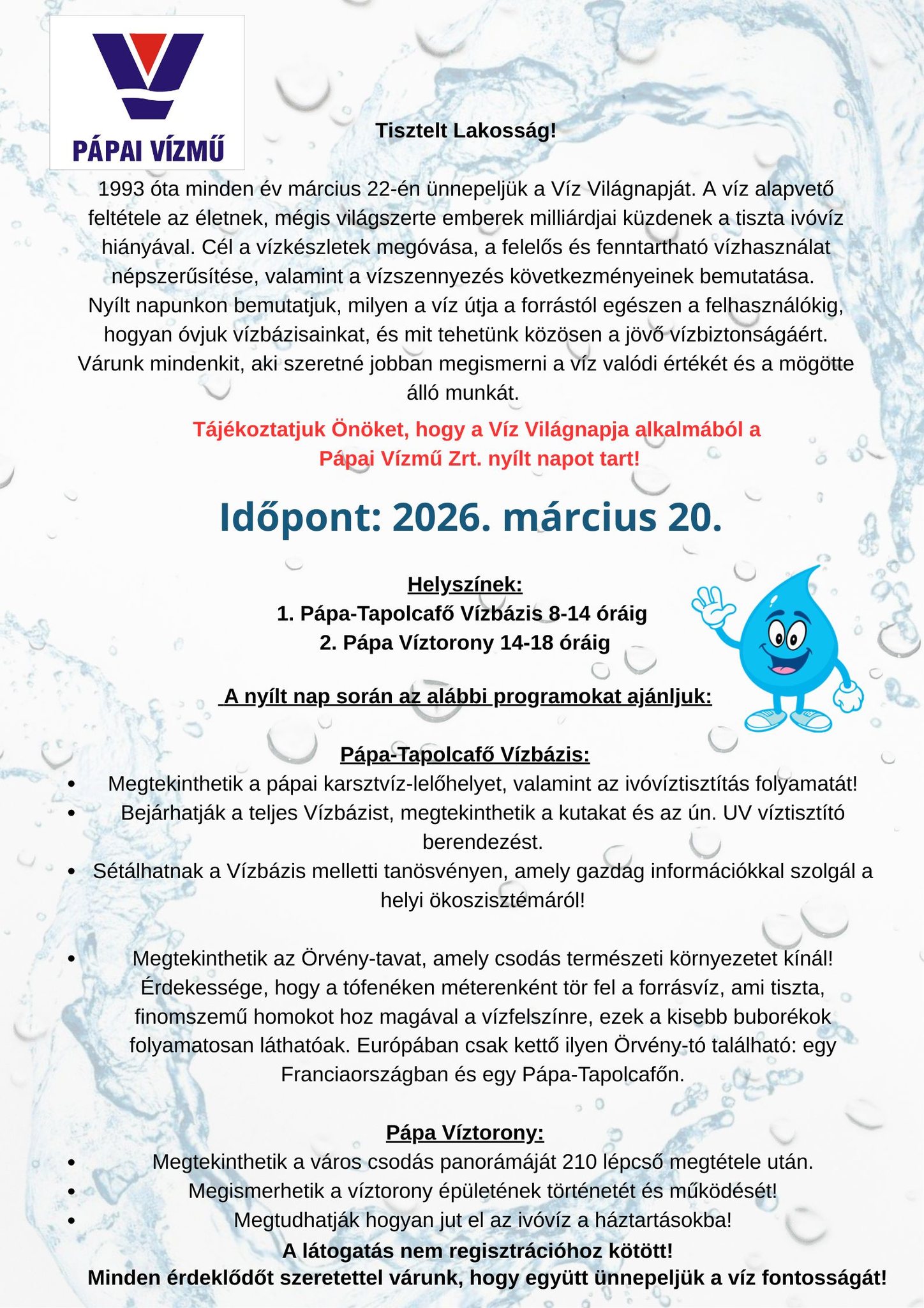 Március 22-e világszerte a víz fontosságára irányítja a figyelmet: 1993 óta ezen a napon ünnepeljük a Víz Világnapját. Az alkalomból a Pápai Vízmű Zrt. nyílt napot szervez, amelyre minden érdeklődőt szeretettel várnak.